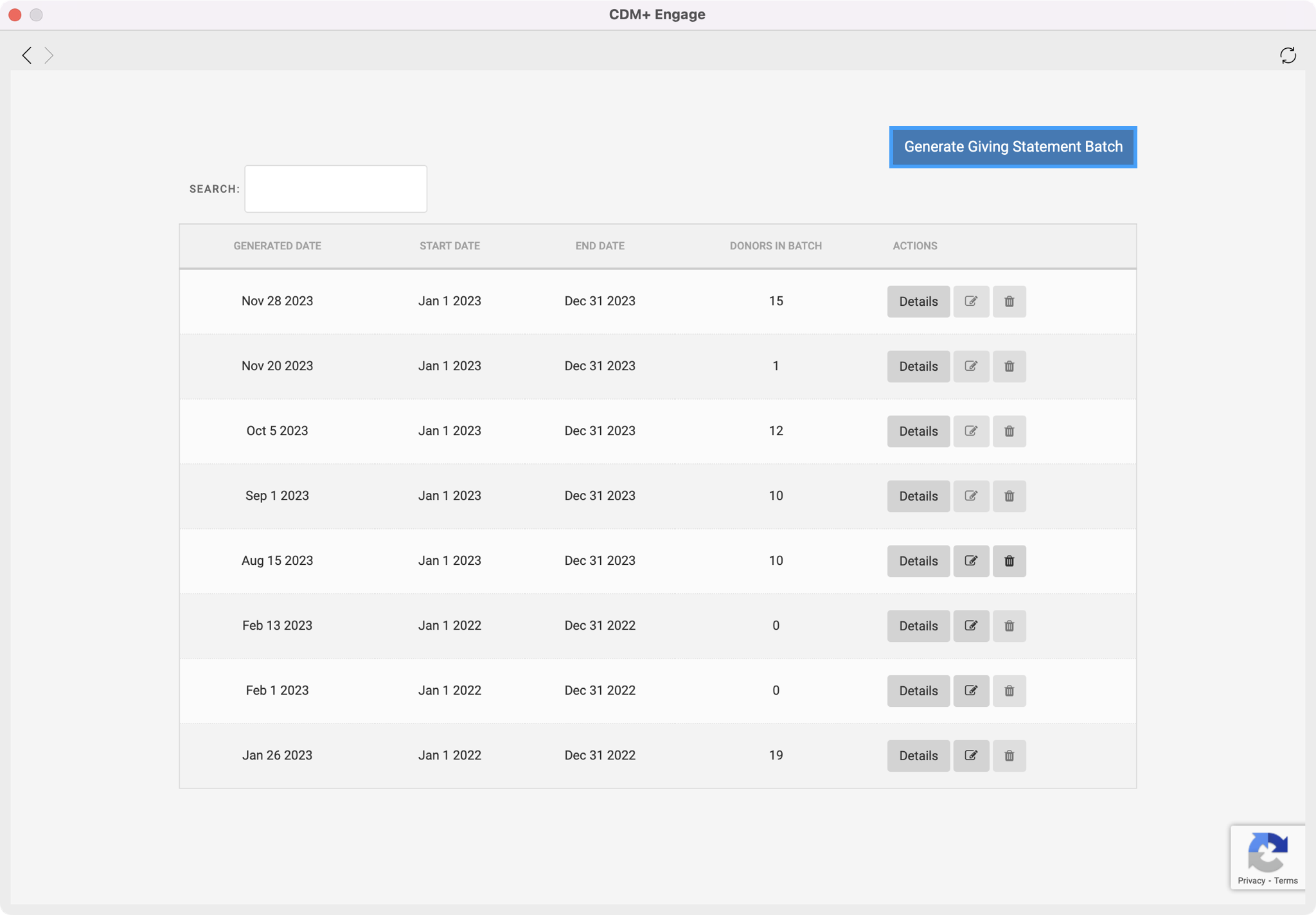 This will take you to the Giving Statement Batch Dashboard. This dashboard allows you to see all previously generated batches that you can view, edit, and delete. You will also create a new batch from this window. Click Generate Giving Statement Batch to create a new batch of statements.