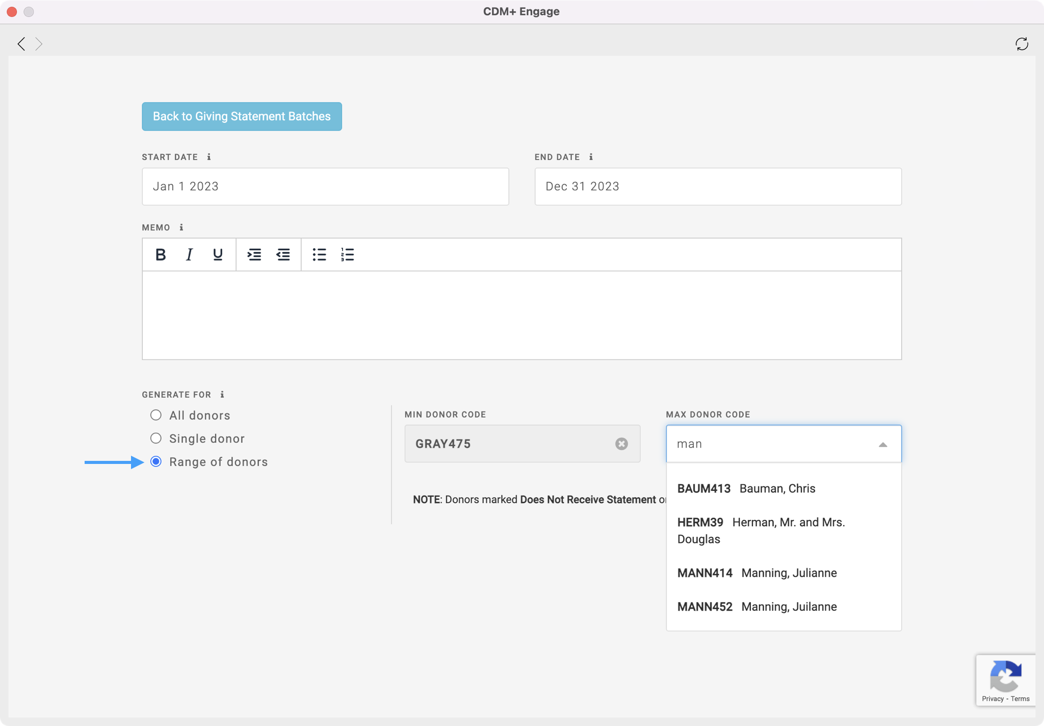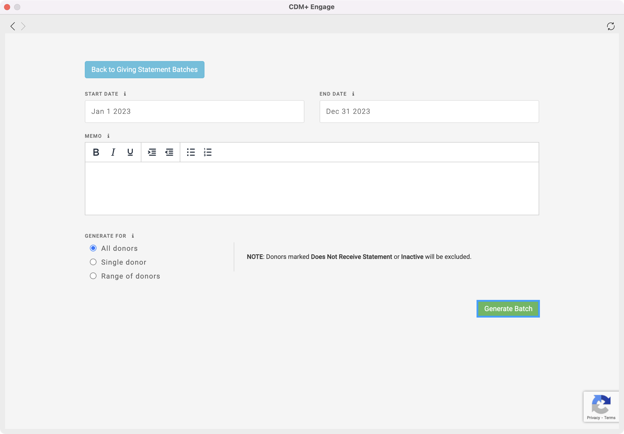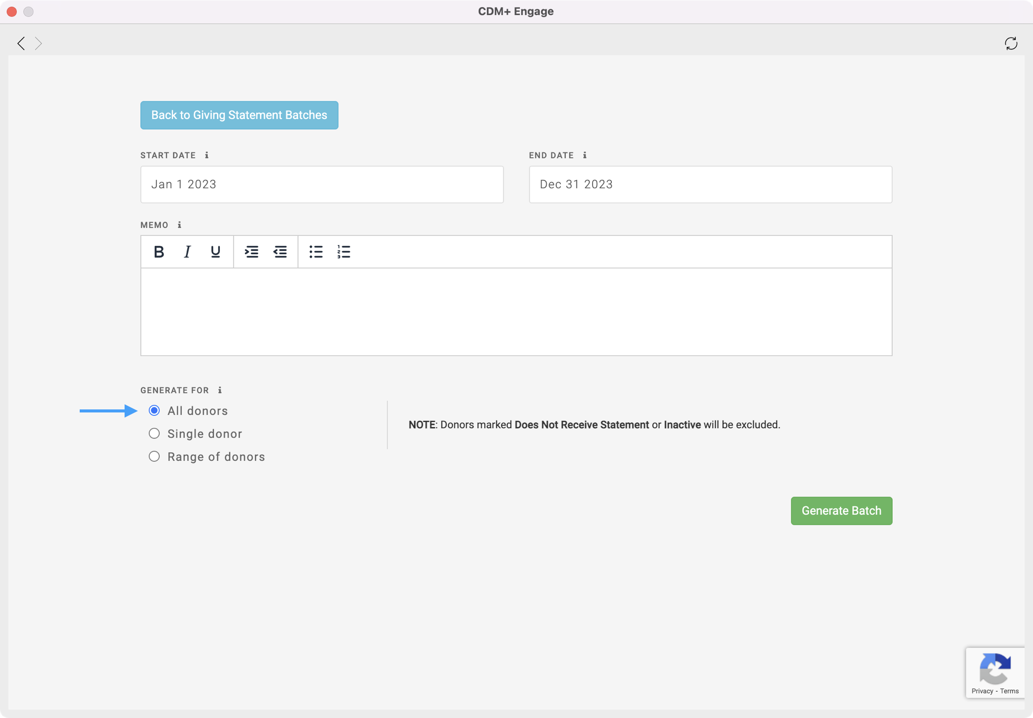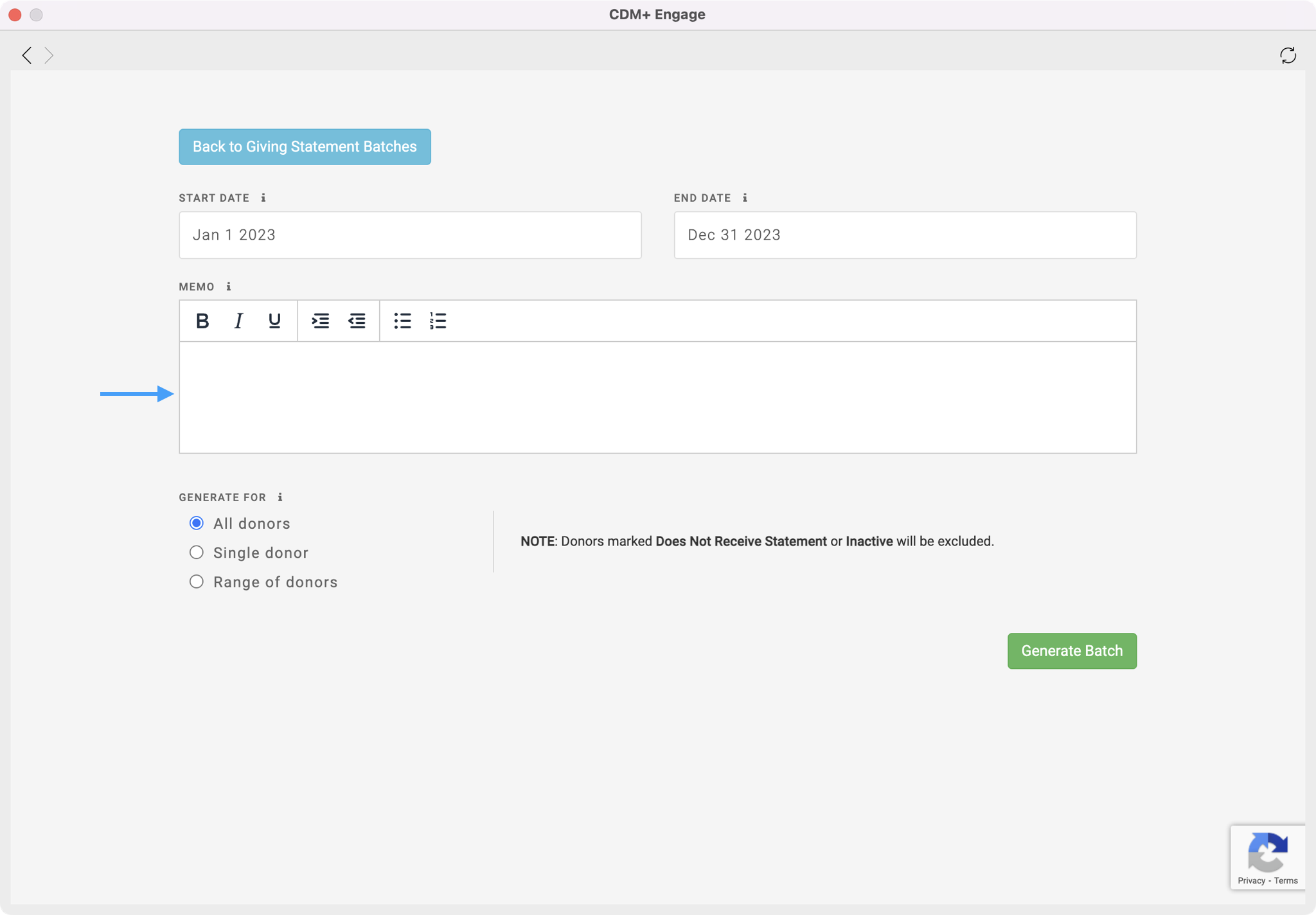 Generating Statements is the first step in delivering statements to your donors. This is where you will decide the date range of your statement, customize the memo, and decide which donors you want to create a statement for.