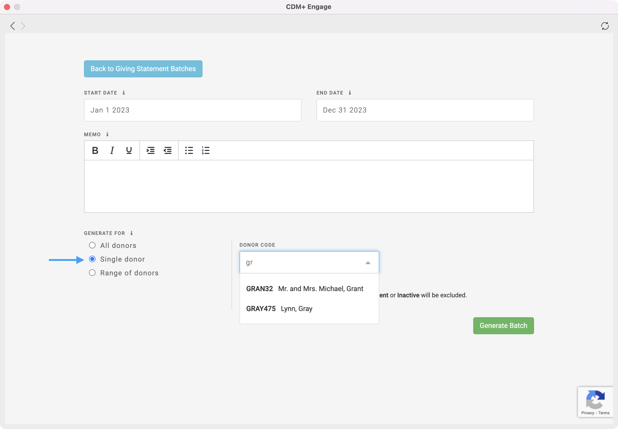 Then, use the radio buttons to determine if you want to generate a batch for All donors, a Single donor, or a Range of donors. When choosing Single or a Range of donors you can use the drop-down fields to select your donors or type in the donor's name or donor code to find those donors.