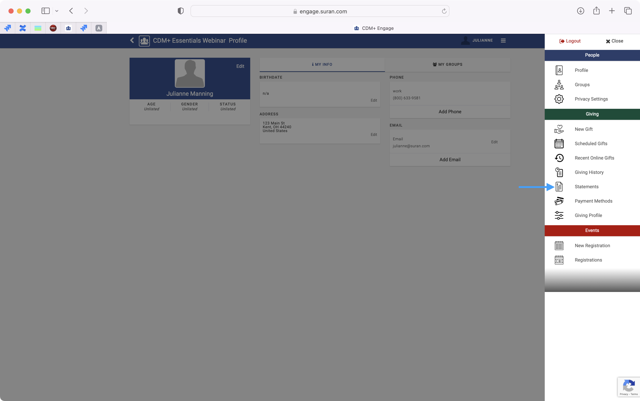 They can view their statement anytime in Engage by going to the right-hand side hamburger menu and then clicking on Statements.