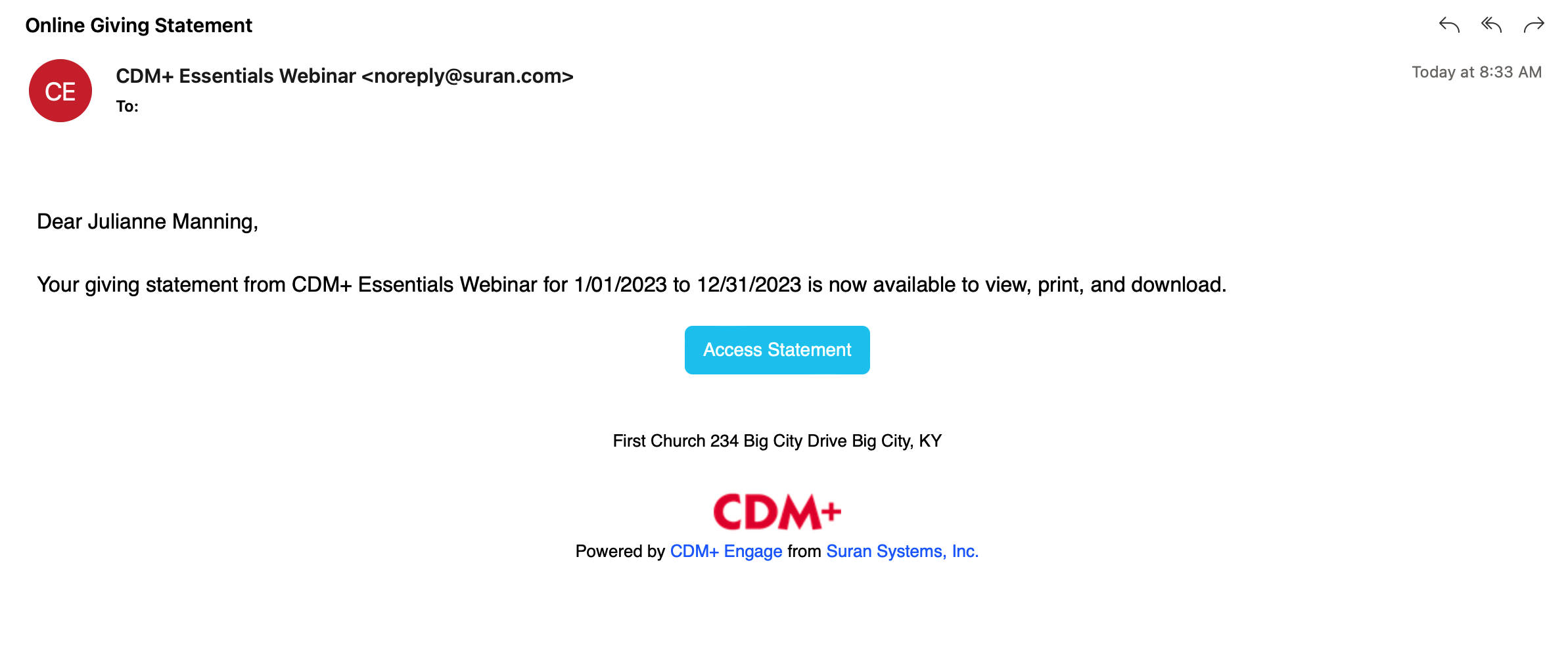 This is an example of an email the donors will receive. They can click on Access Statement to be taken to Engage.
