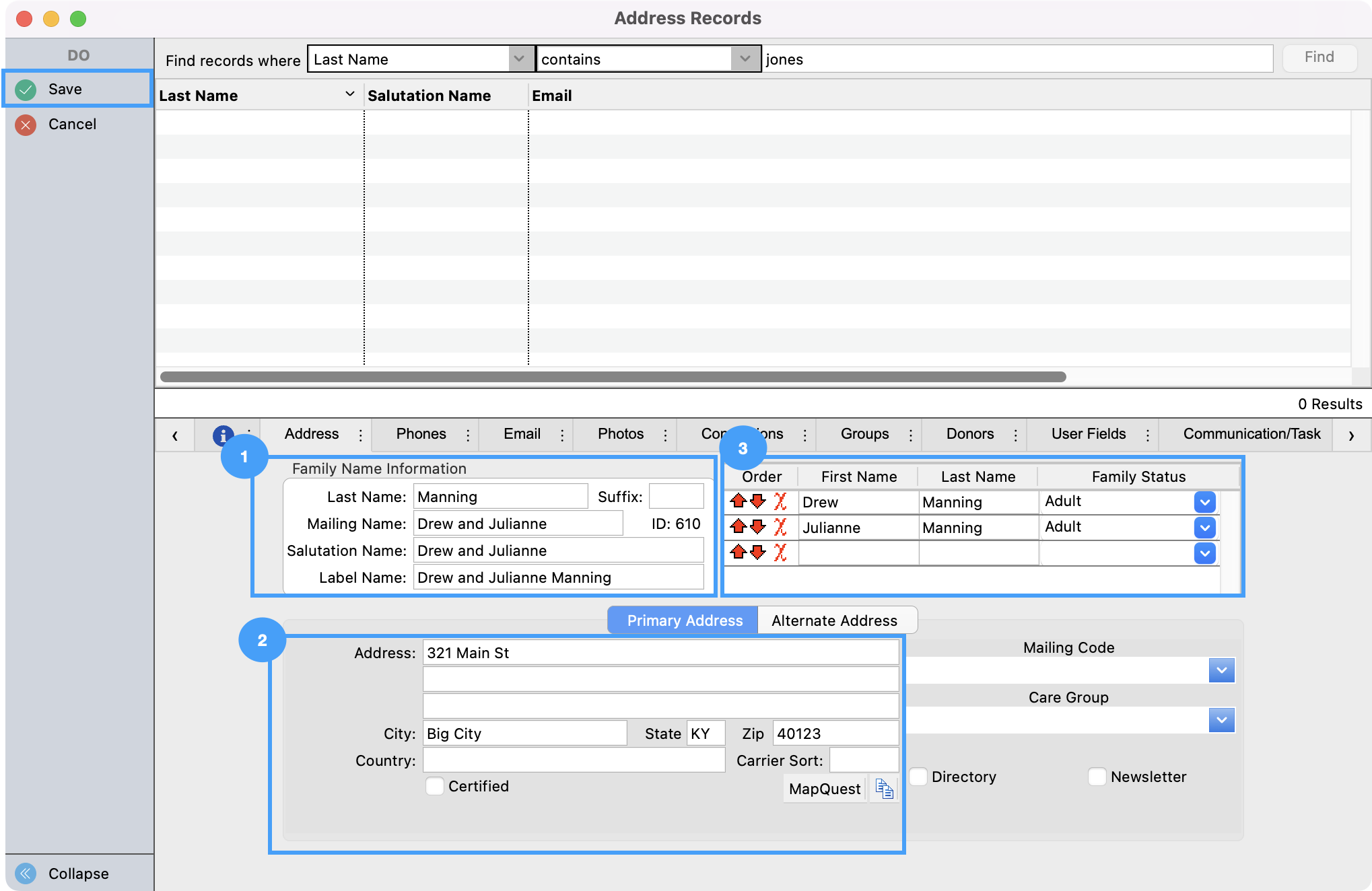First, you will want to enter in the donor's Family Name Information. Make sure to add details in both the Mailing Name and Salutation Name fields. Traditionally, the Mailing name is the more formal name (Robert) while the Salutation field is more informal (Bob). Second, you'll enter in their address information. Thirdly, you'll list the donors in the "Family Status" box. Please note this is a very important step as this is what will create their Individual Record. You can list other individuals at this same address in this section as well. Then, Save your changes in the upper left-hand side of the menu.