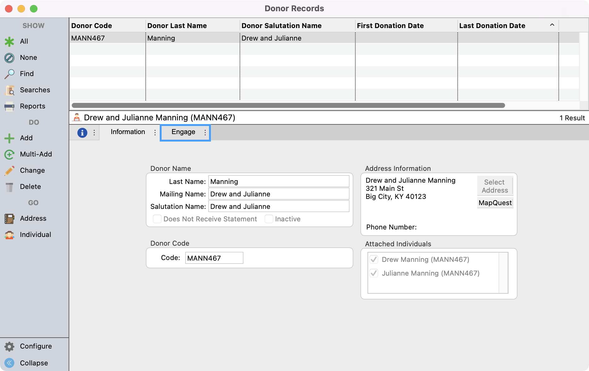 12. Then, click on the Engage tab under the Donor’s record. Then just fill out the Engage form to make a new donation on behalf of the donor.