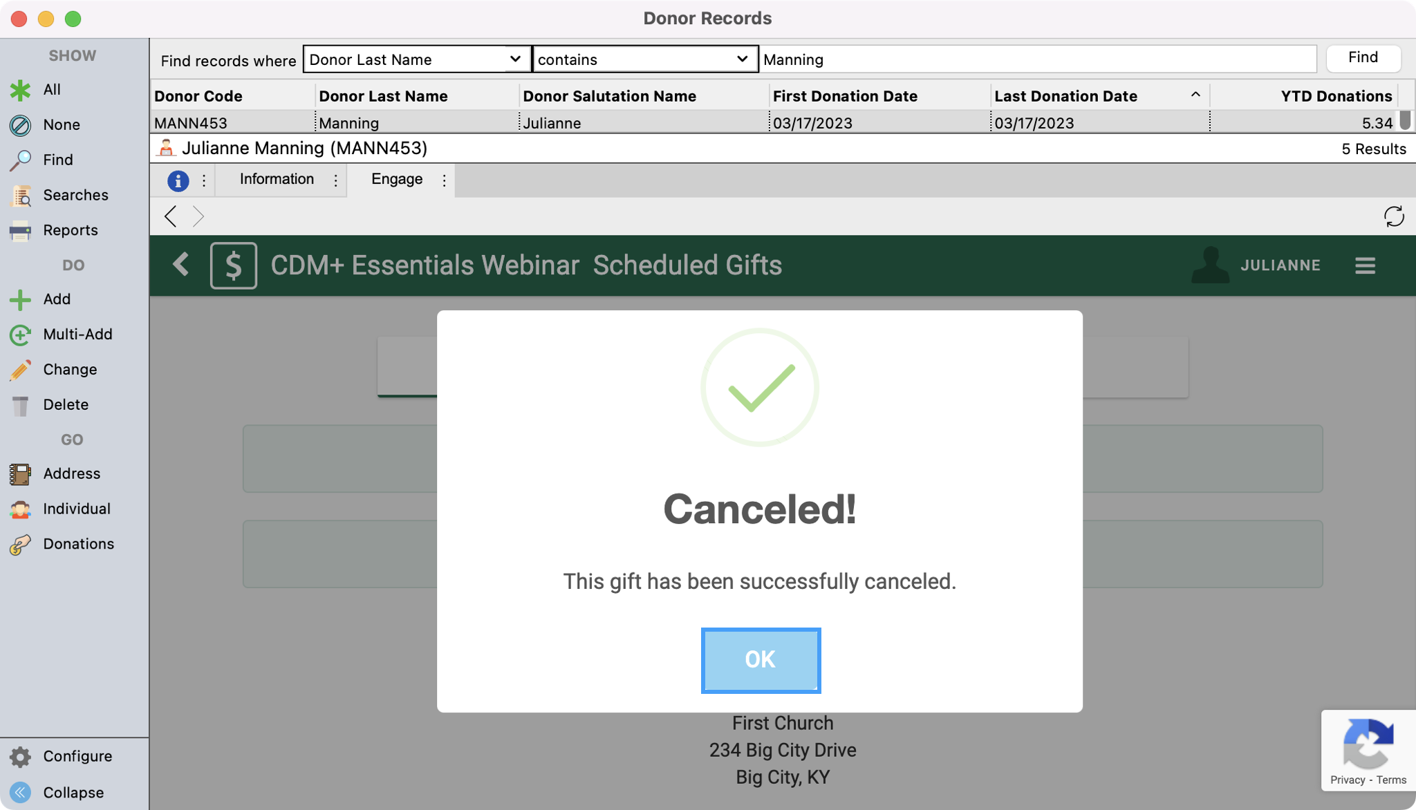 You will then see a pop-up box confirming the recurring donation has been canceled. Click Ok.