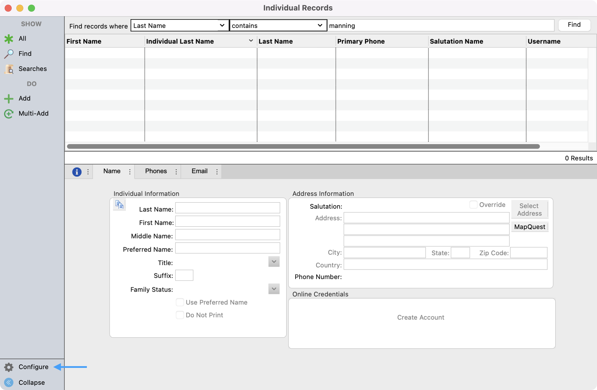 To configure your Individual Records window from the Welcome to CDM+ window, click on Individual Records.