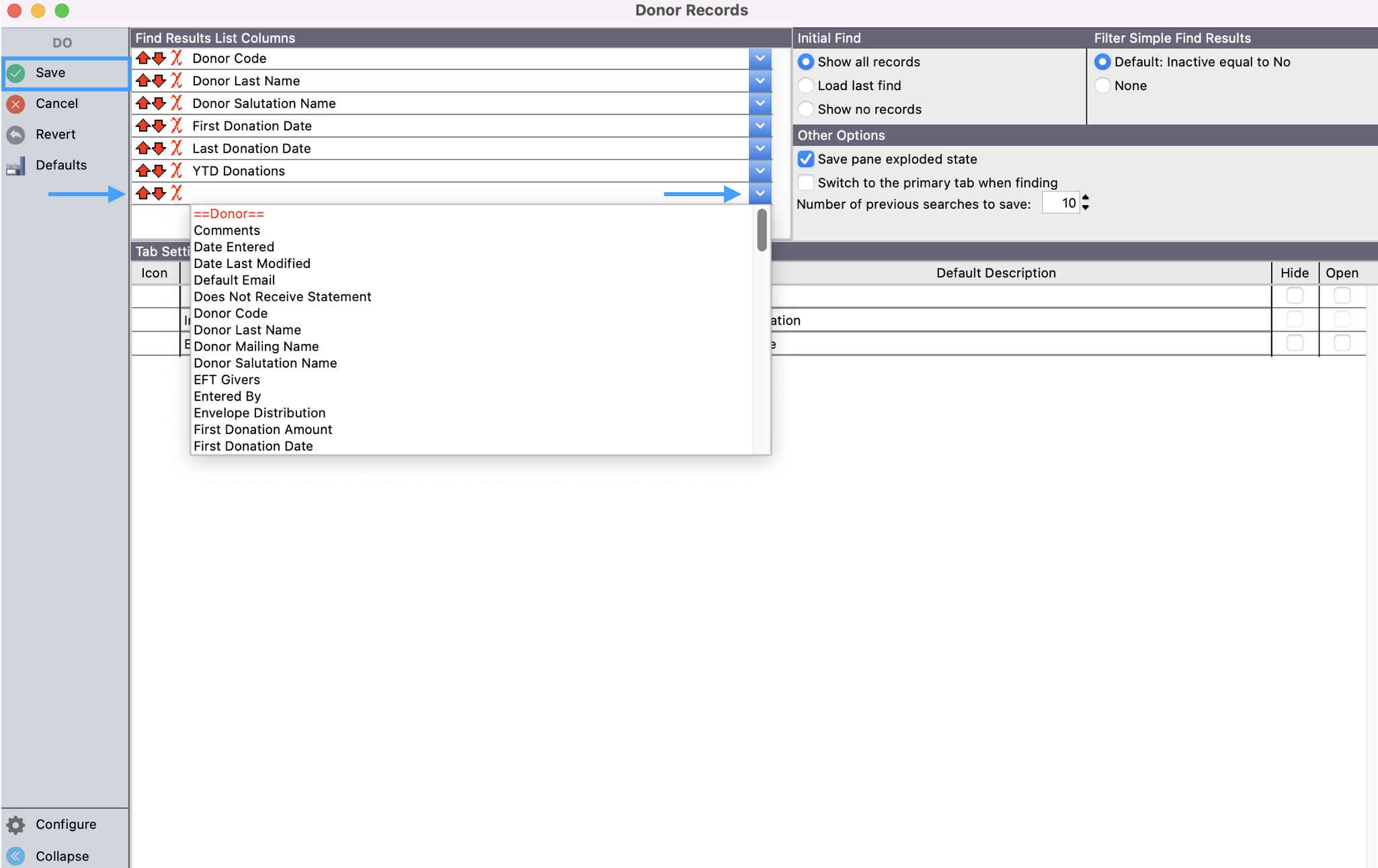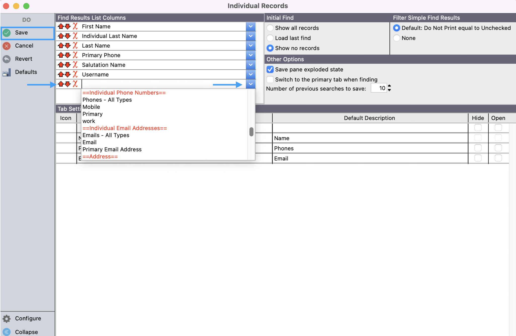 You can use the drop-down list to select the different fields you want to see in your results window. If you want to remove a field, click on the red X. You can also use the red arrow buttons to move the fields up and down to be in your desired order. Then, click on Save in the upper left-hand corner to save your settings.