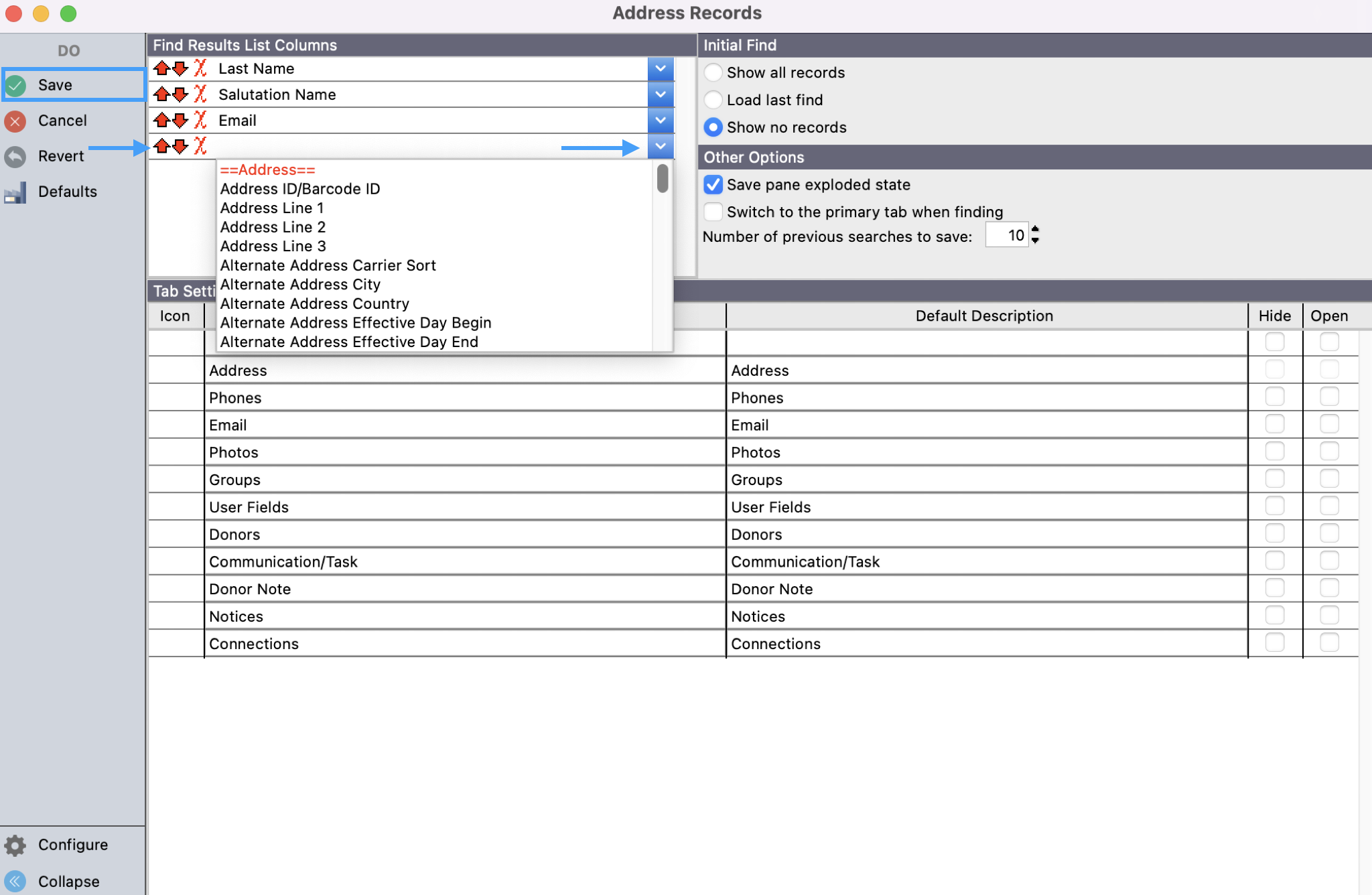 3. You can use the drop-down list to select the different fields you want to see in your results window. If you want to remove a field, click on the red X. You can also use the red arrow buttons to move the fields up and down to be in your desired order. Then, click on Save in the upper left-hand corner to save your settings.