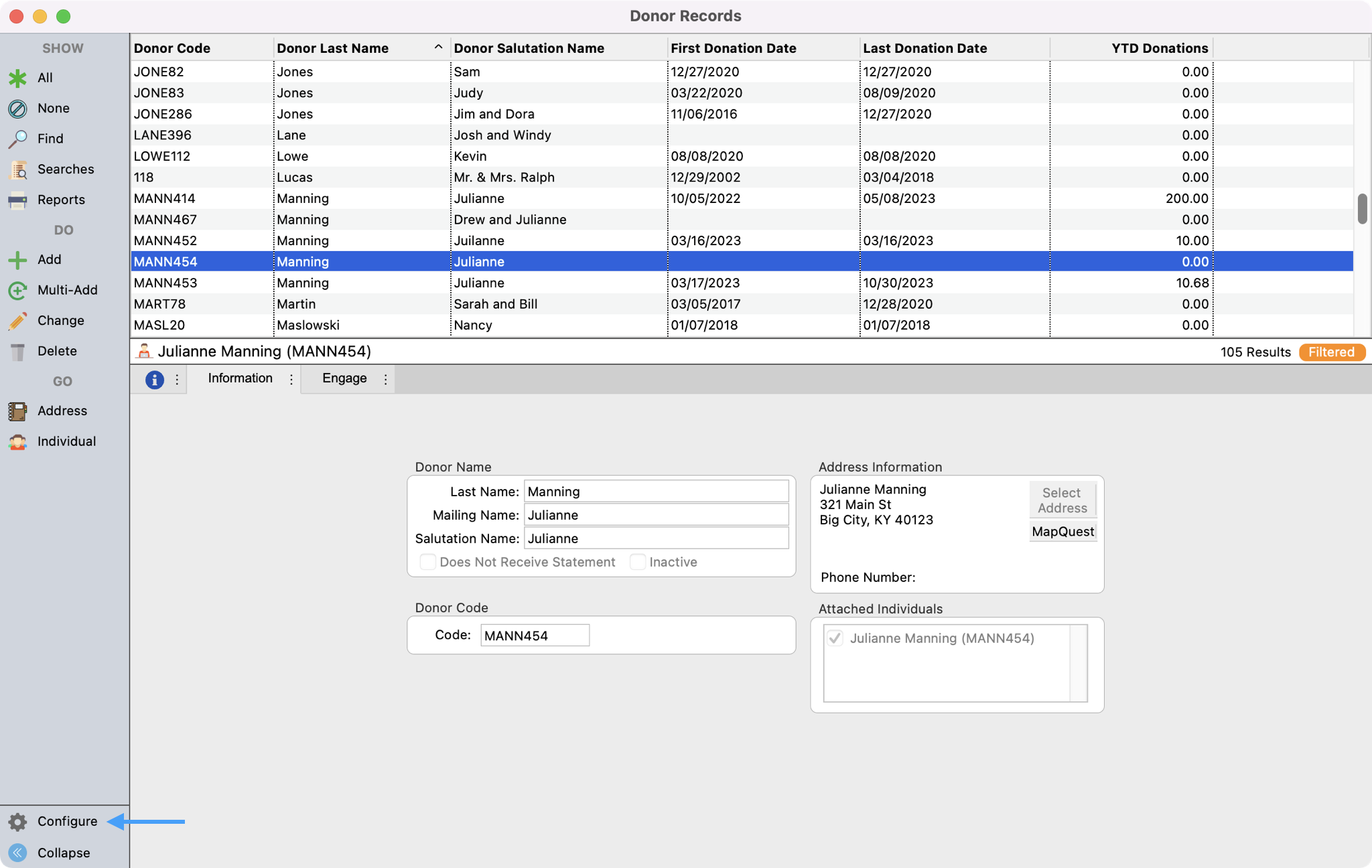 To configure your Donor Records window from the Welcome to CDM+ window, click on Donor Records.
