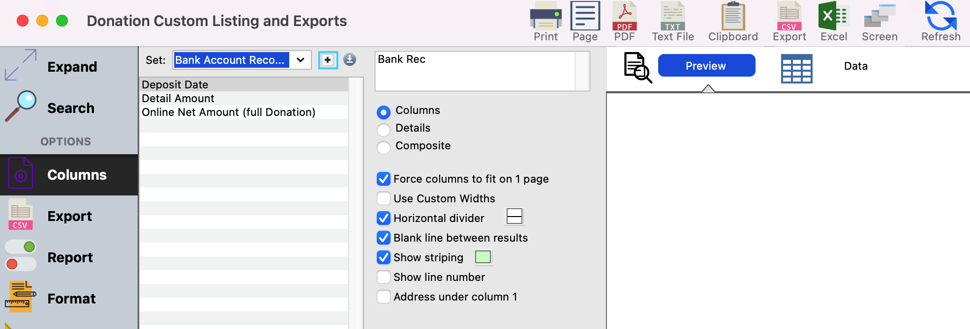 2. The new window that opens is the Donation Custom Listing and Exports window.
