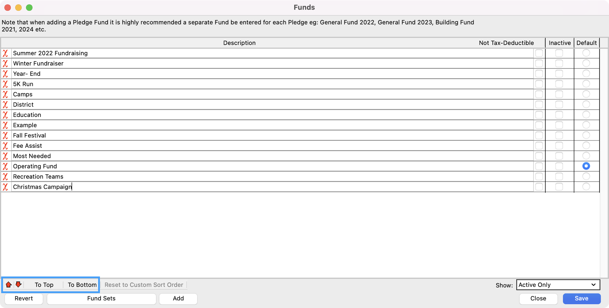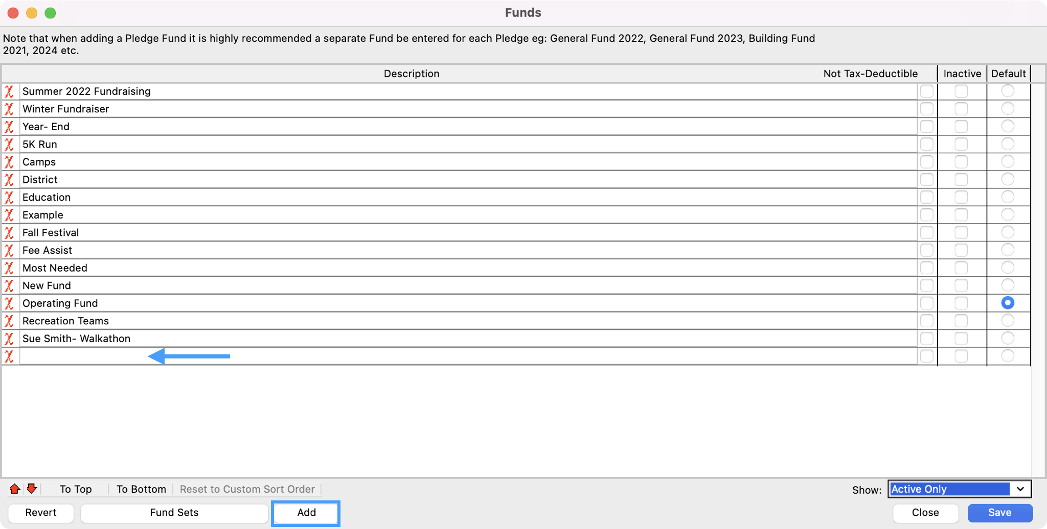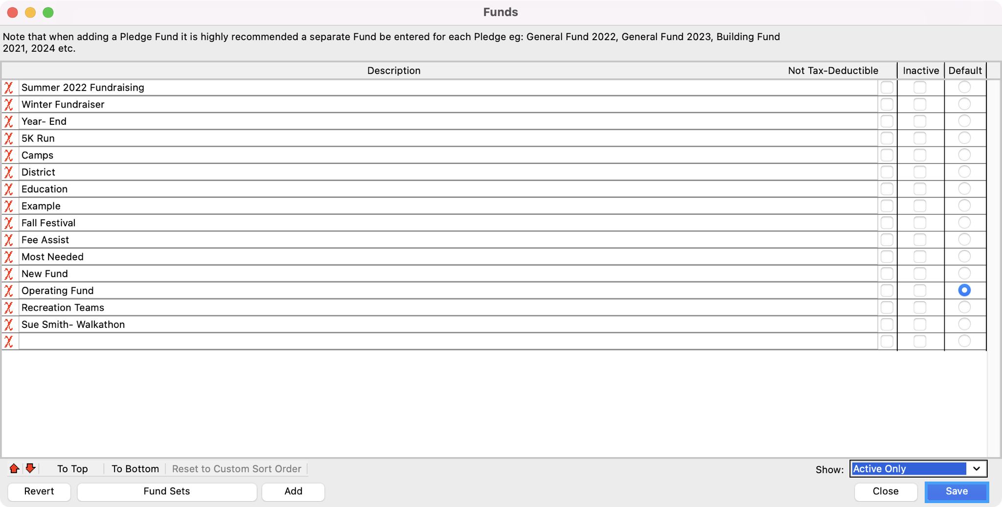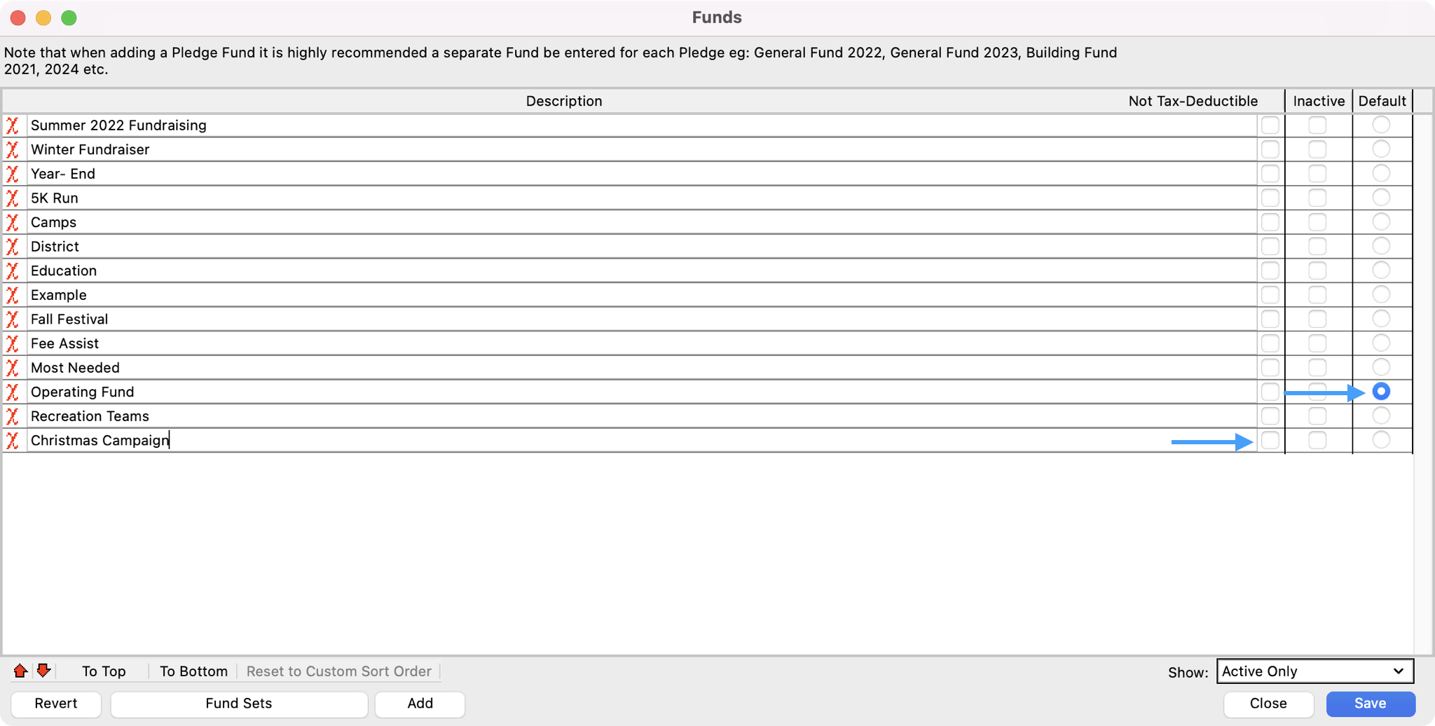 - When applicable, you can also choose to make a fund Non Tax-Deductible by putting a check in the Non Tax-Deductibe box. If you want to make a fund the default option when adding in manual gifts, you can put a dot in the radio button in the Default column.