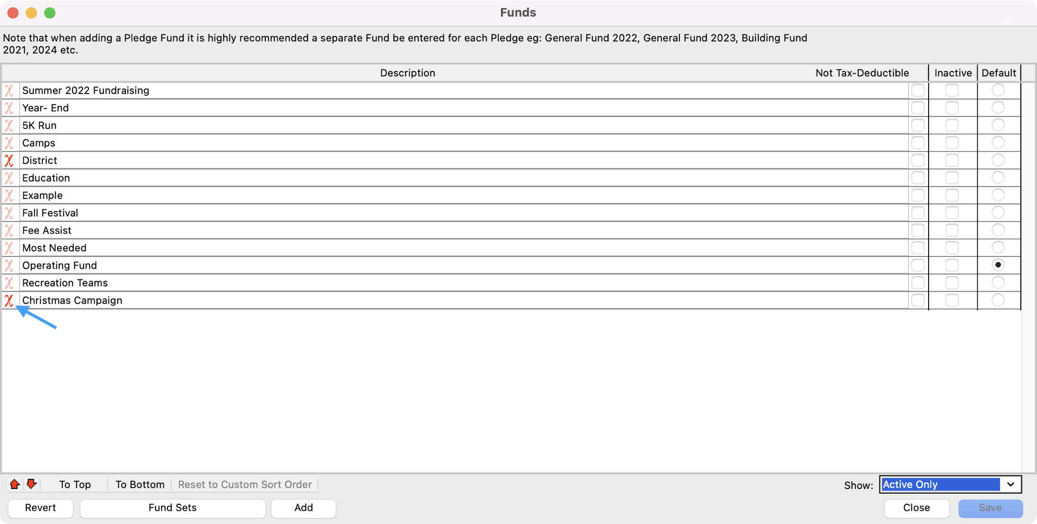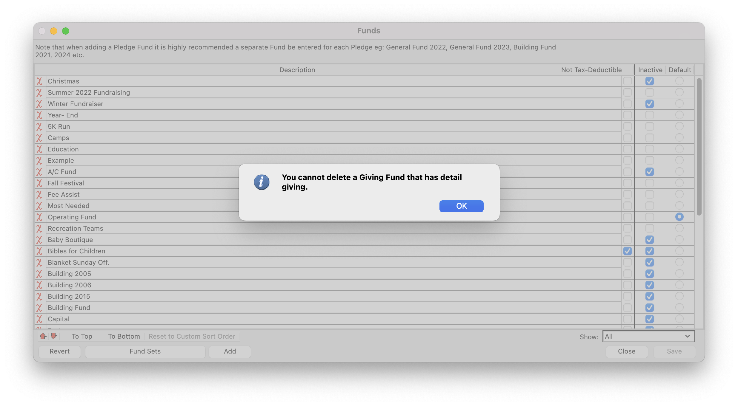 If donations have been made to this fund, when you click on the red X, you'll see a pop-up letting you know this fund cannot be deleted. Simply click on Ok. You can choose to Inactivate the fund instead.
