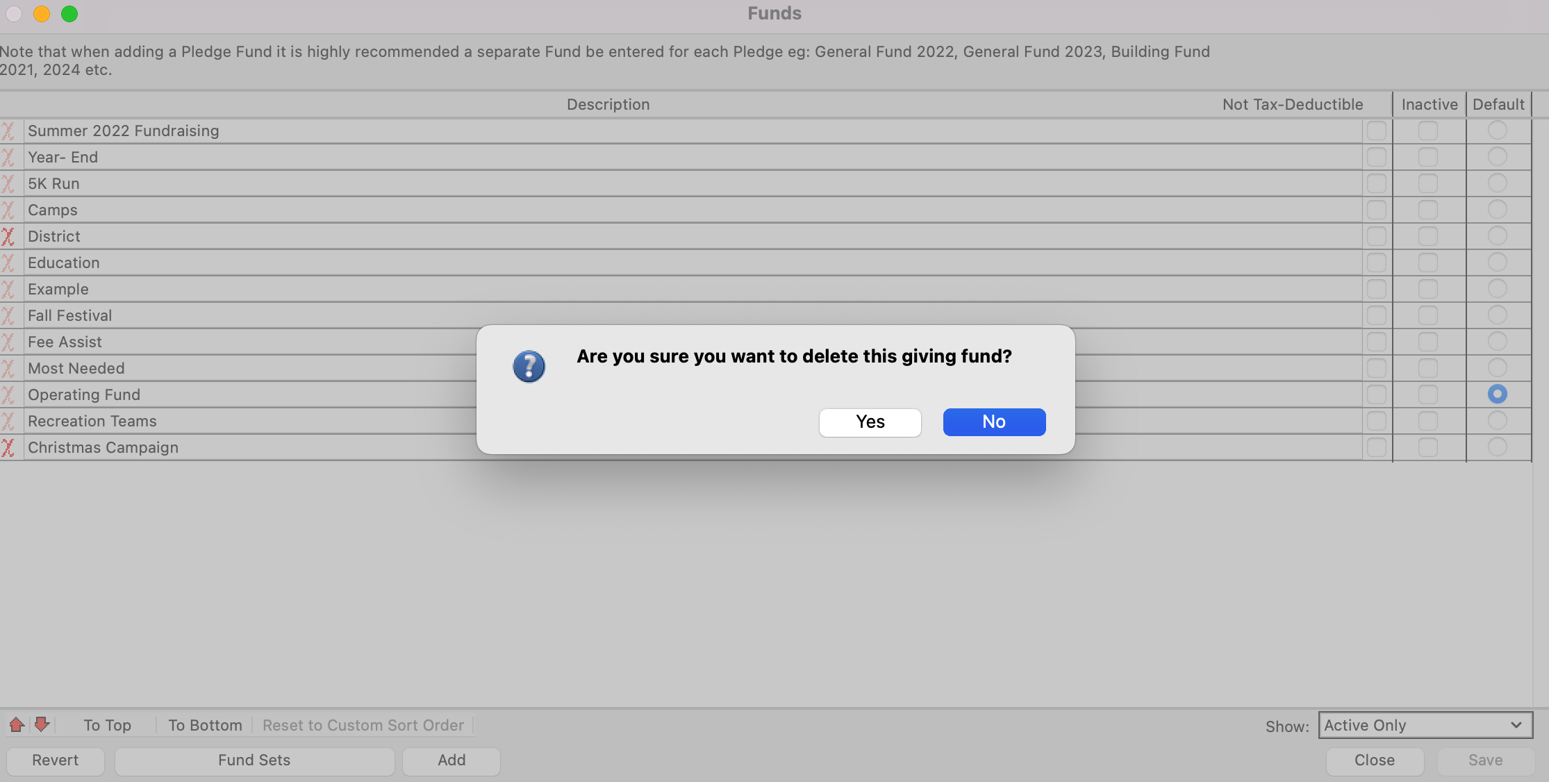 If no donations have been made to this fund you'll see a pop-up asking you if you are sure you want to delete this fund. Click on Yes.