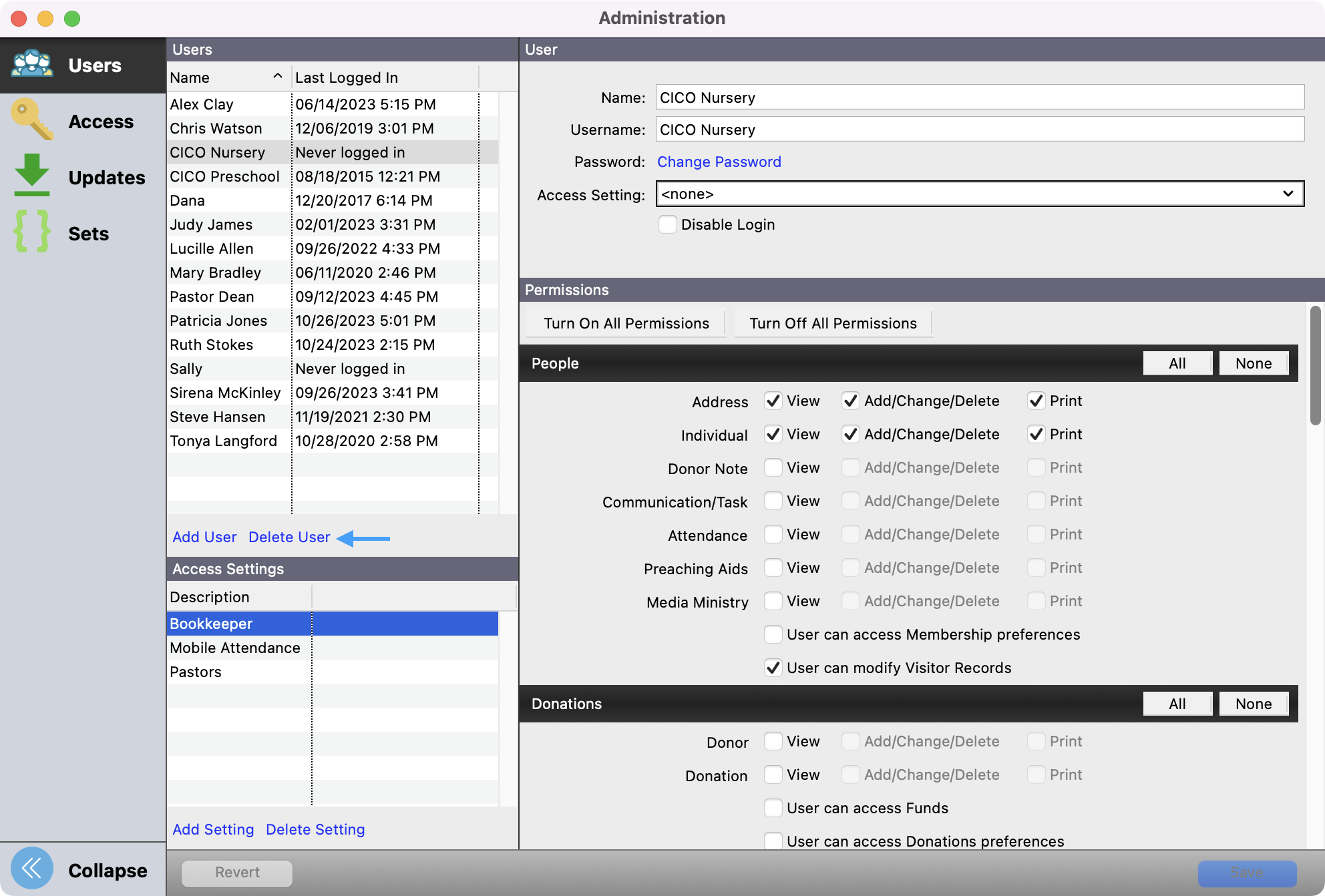 Click to highlight the name of the user you want to delete and then click Delete User.