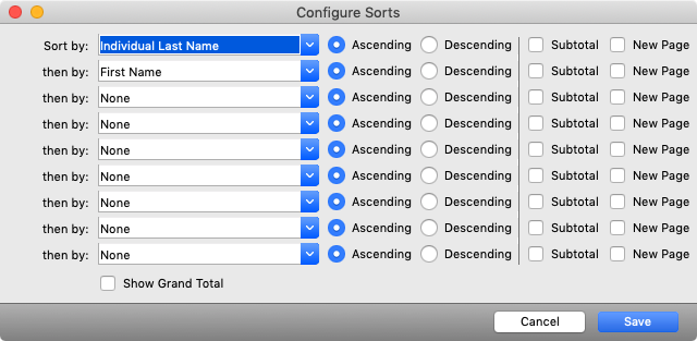 If you’d like to group and subtotal the report by a particular field, check Subtotal. This option works particularly well for fields, such as Deposit ID, Fund, Full Donor Name. To have the report start a new page each time the subtotal group changes, check New Page. You can also choose to check the Show Grand Total box to see the totals for each field. Click Save when finished.