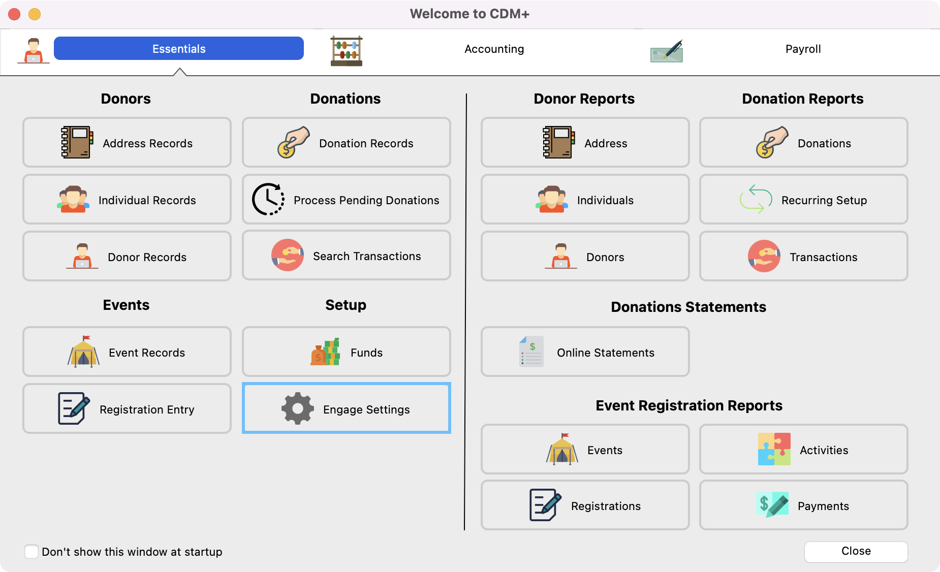 - To Edit a giving set, from the Welcome to CDM+ window click Engage Settings.