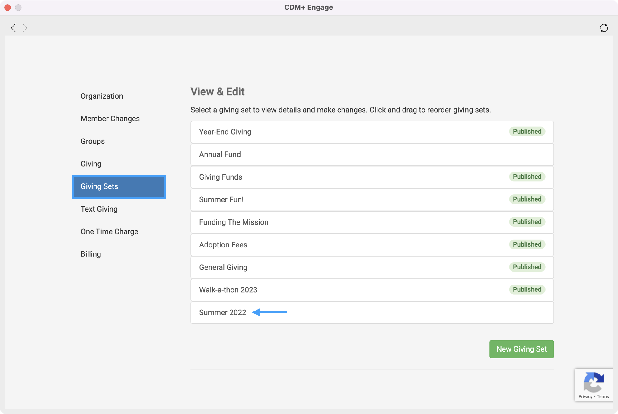 - Next, click Giving Sets from the left-hand side menu and then click the Giving Set you need to update.