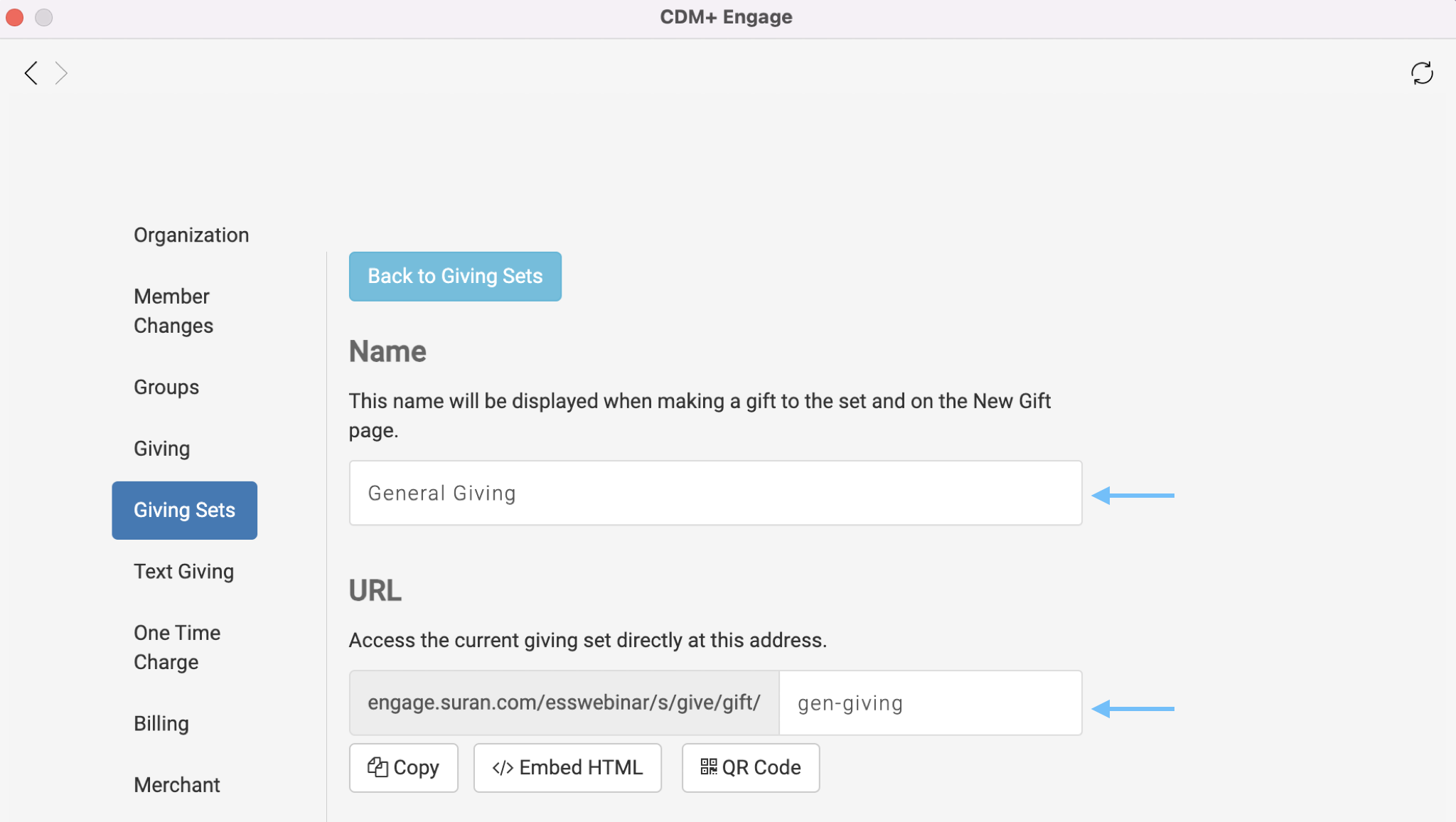 - When you are finished, simply scroll down to the bottom of the page and click on Back to Giving Sets.