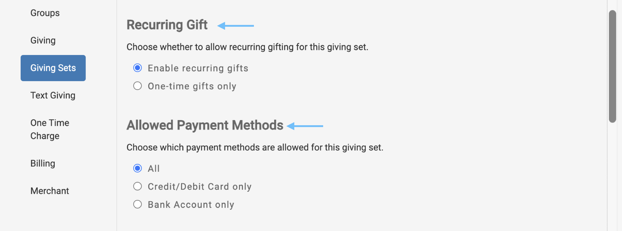 Scroll down a little further and you can edit your choice on if you want to allow recurring donations on this giving set or set it up to receive one-time gifts only. If you choose Enable recurring gifts, your donors will be able to choose either a recurring or one-time donation. You can also decide if you want to allow All payment method, Credit/Debit only, or Bank Account only.