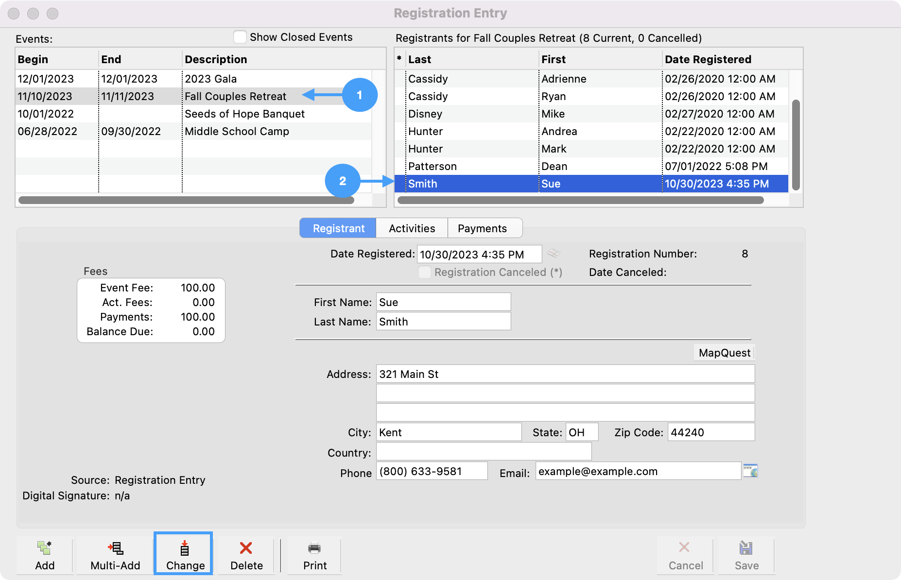 Click to highlight the name of the Event record on the left-hand side. Then, scroll through the list of registrants on the right and click to highlight the attendee you need to modify. Click on Change on the bottom of the window.