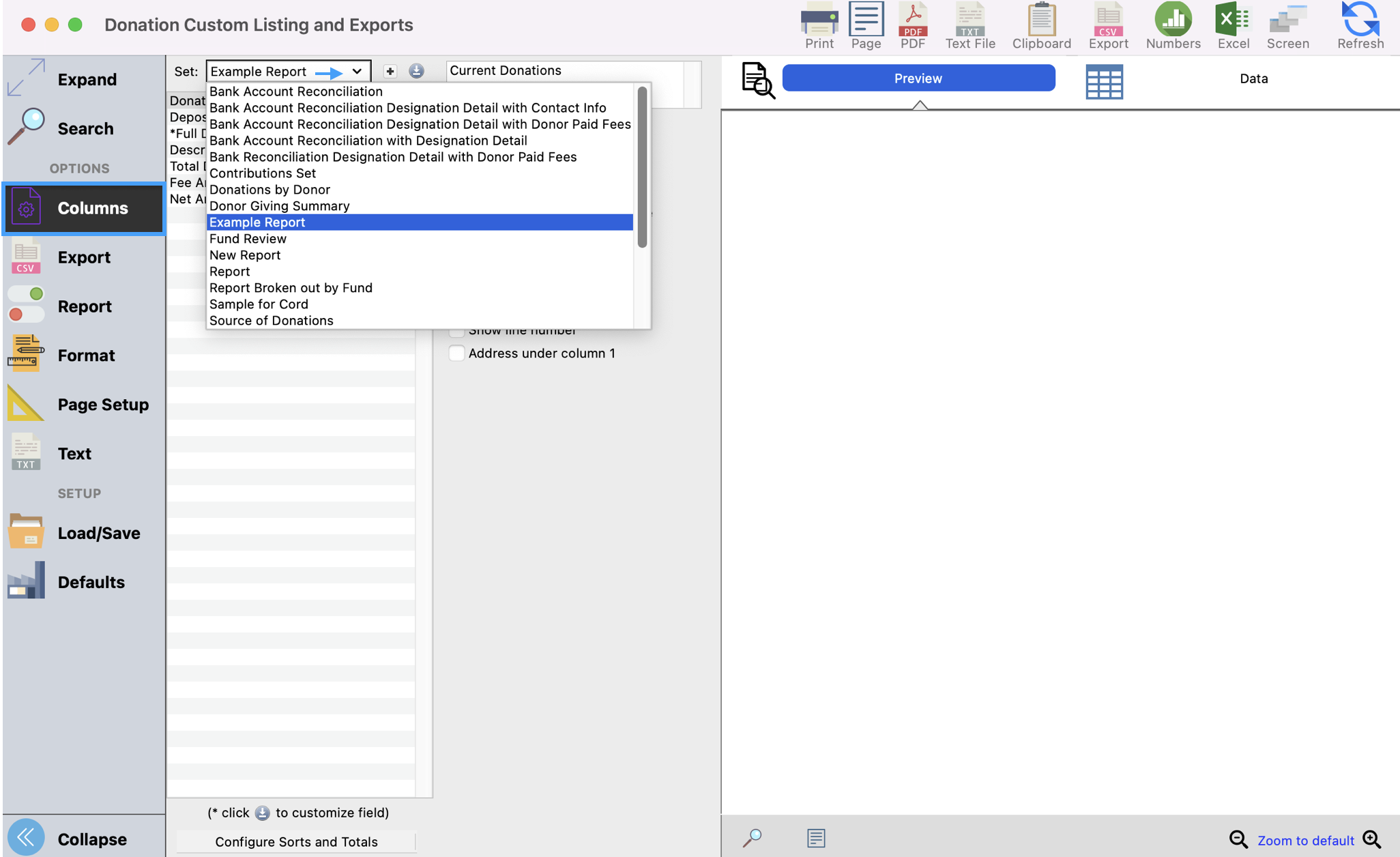 In the Report window, click on Columns from the left-hand side. Then, click on the Report Set drop-down list and select the report you want to modify.