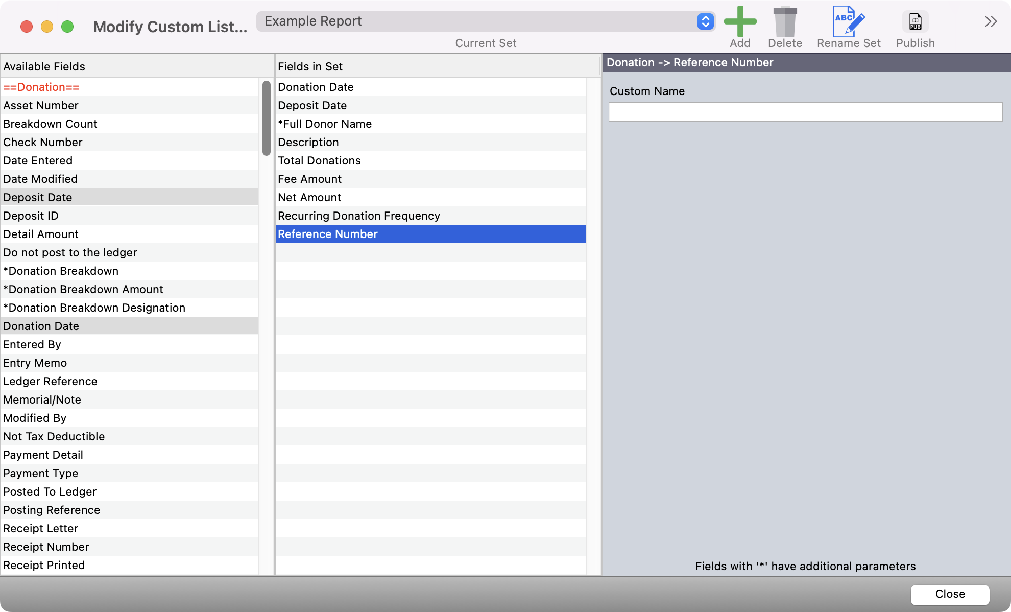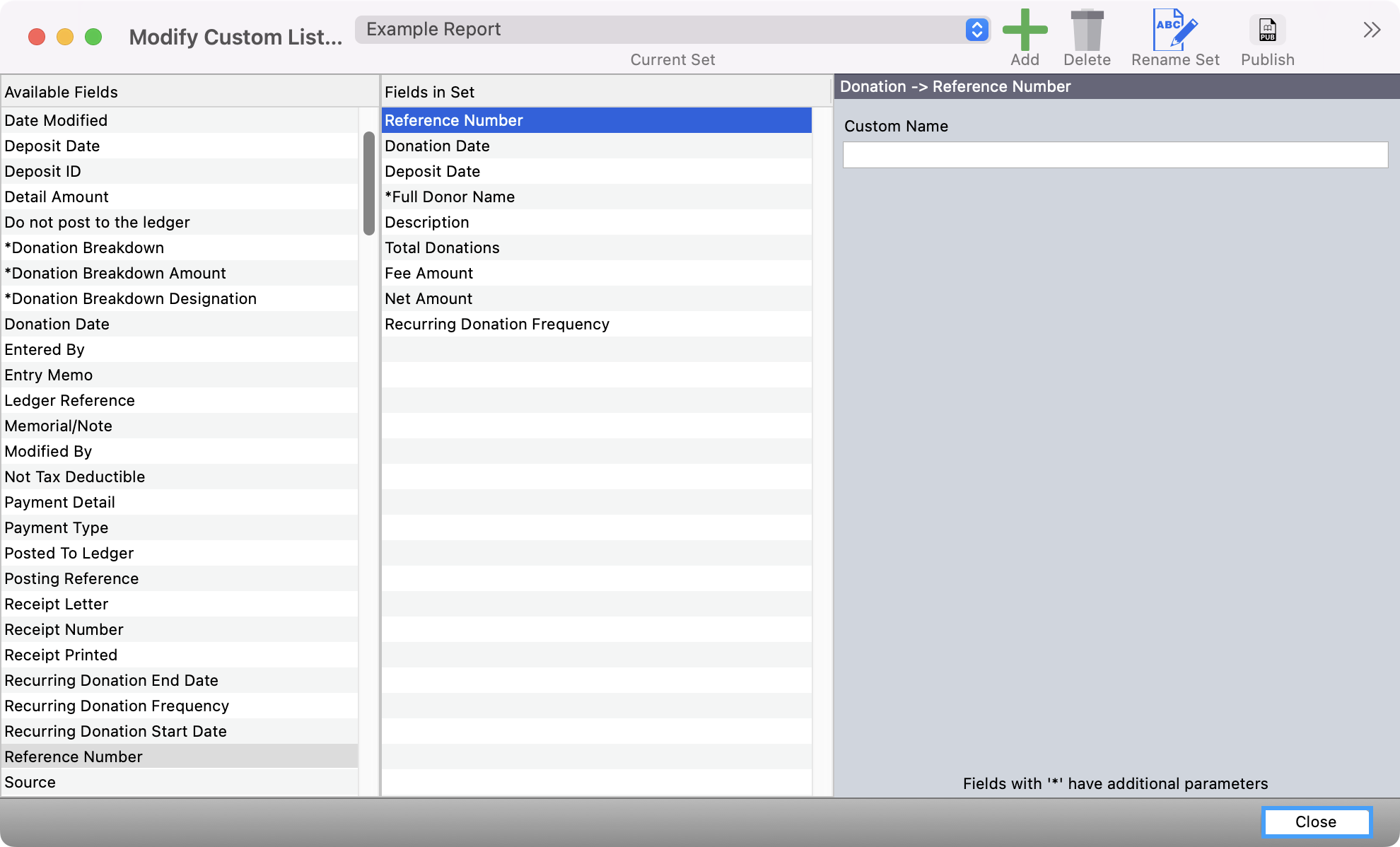 This opens up your fields manager. From here you can double-click or drag and drop the Available Fields to the Fields in Set columns and vice versa to select the fields you want in your report. Once you have selected the fields you want in your set, you can also drag the fields in the Fields in Set columns to be listed in the order of your choice. Click on Close once you have finalized your selection and order.