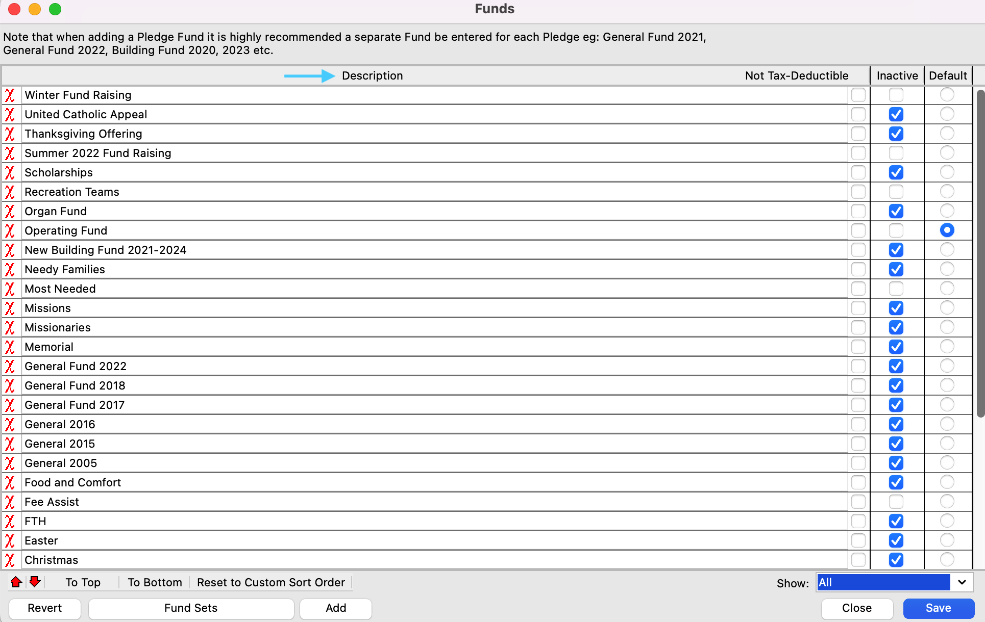 This will open up your Funds window. If you want your Funds listed in alphabetical order, simply click on the Description header in the Description column.