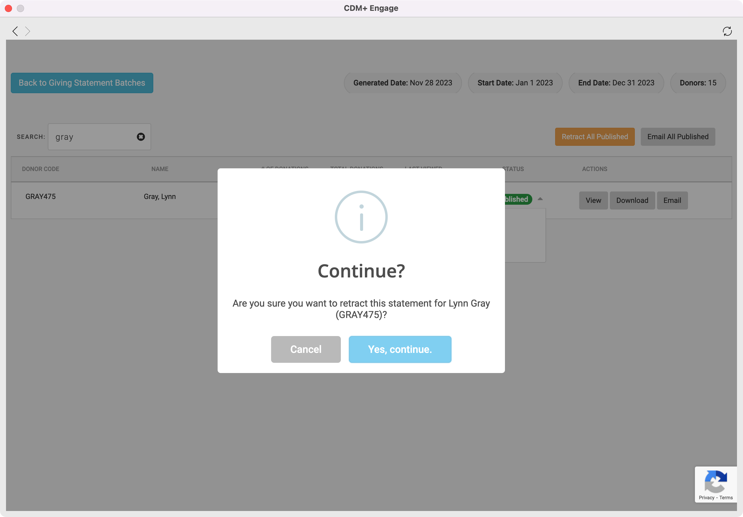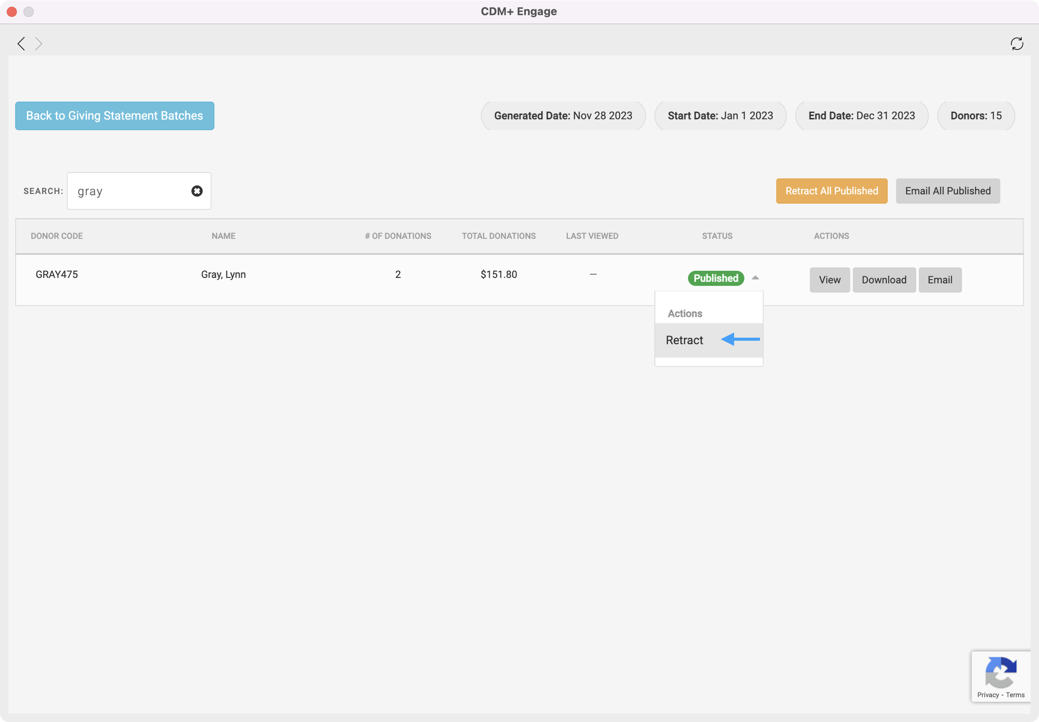 If you realize an error was made for one of your donor's giving statements, you can choose to retract the statement and fix the error. When you retract a statement, the donor will no longer be able to view this statement from their Engage account.