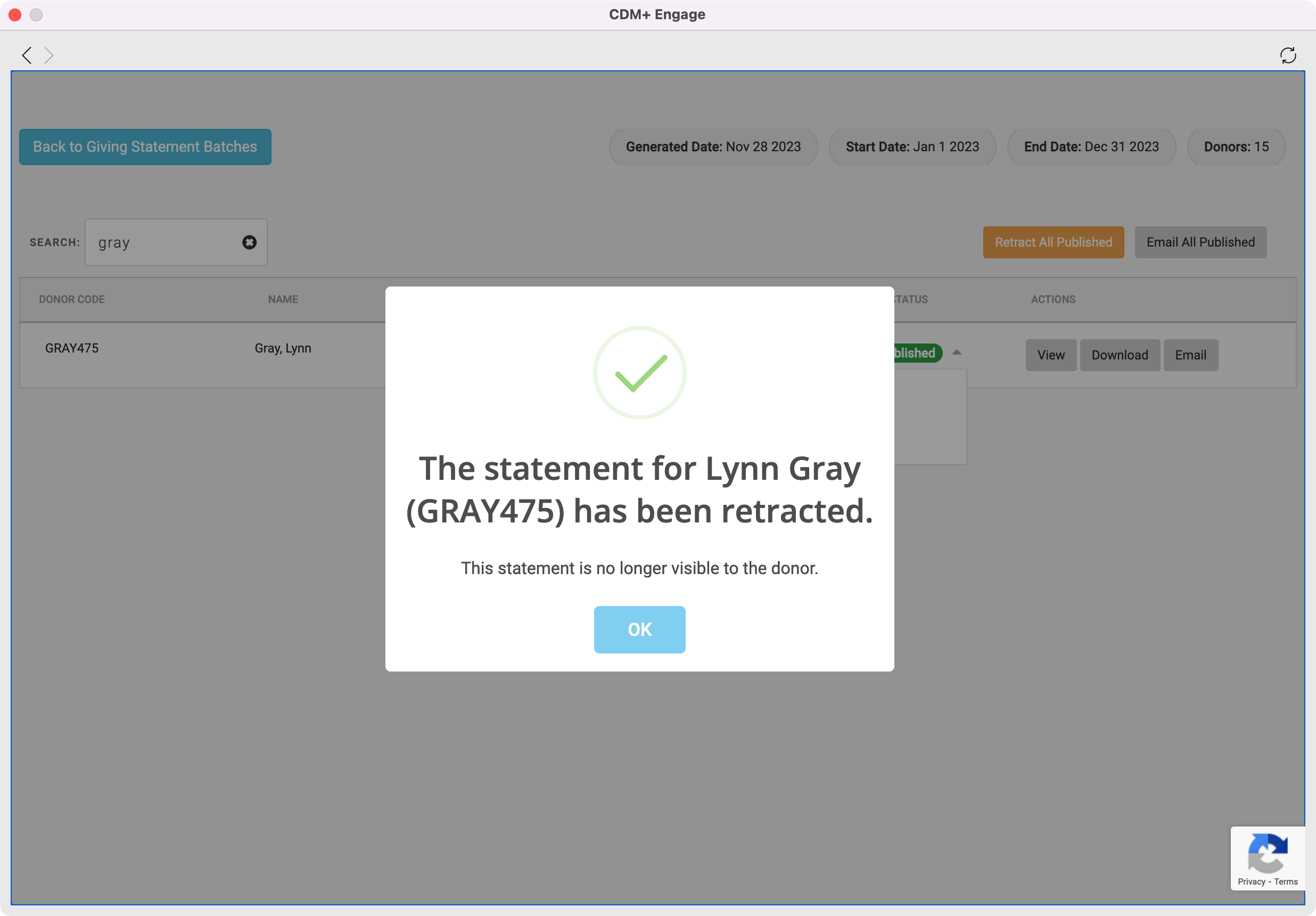 You will then get a pop-up box letting you know the statements have been retracted and is no longer visible to your donors. Click on OK.