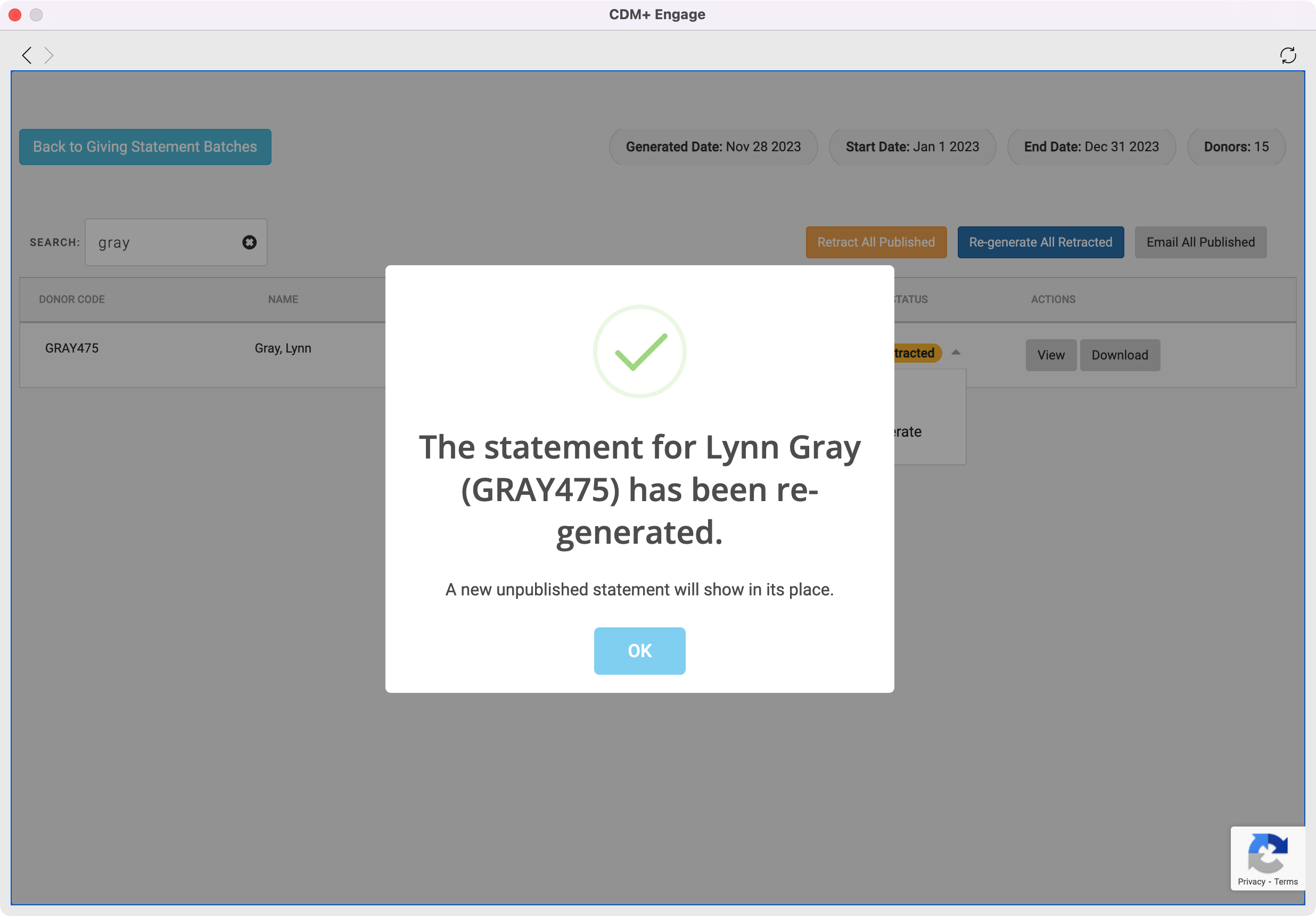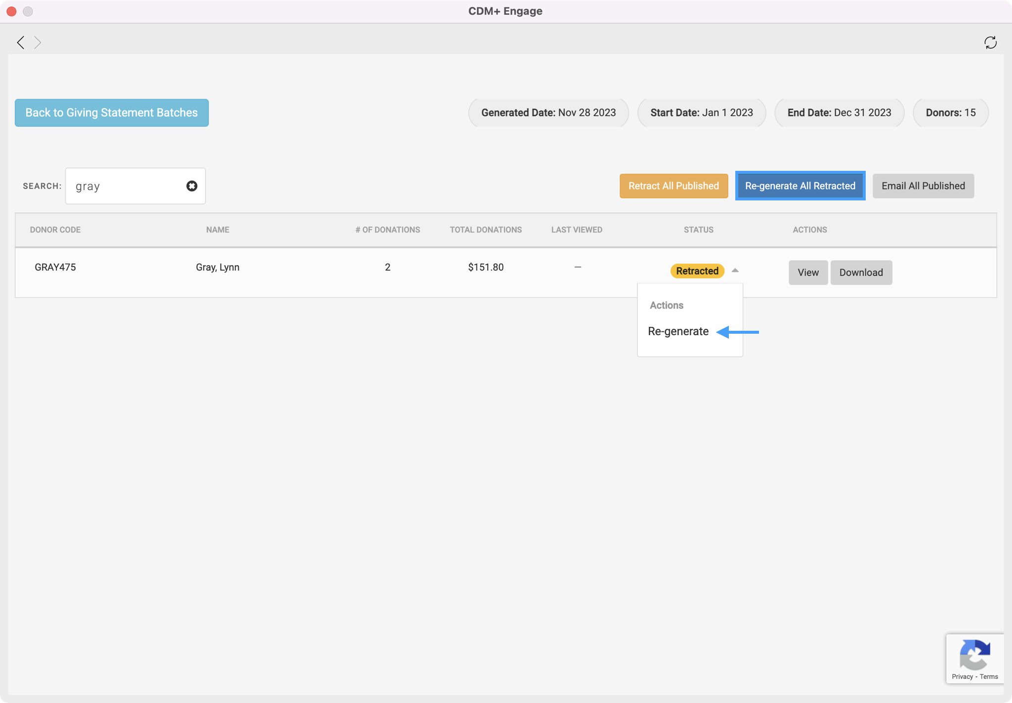 Once you make the necessary updates to the statement, you can go back to the Giving Statement Batch Detail page. Then click on the Re-generate All Retracted button or use the drop-down option in the status column to re-generate the statement.