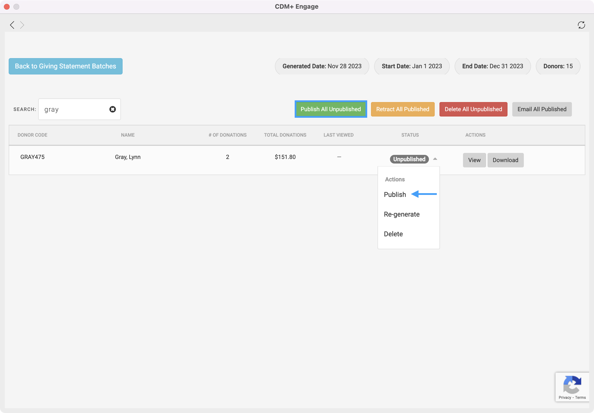 Then, click on Publish All Unpublished button or use the drop-down option in the status column to publish the statement to make it visible to your donor again.