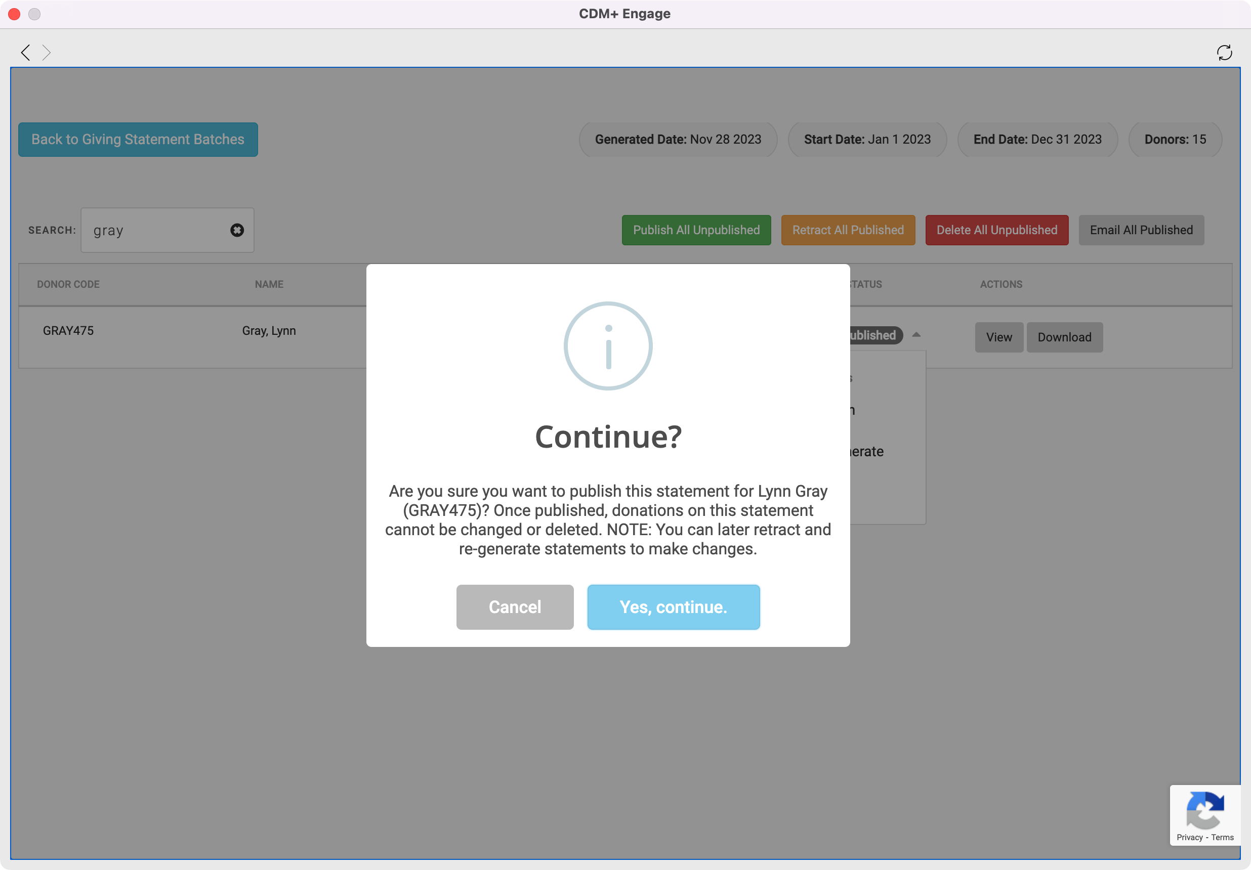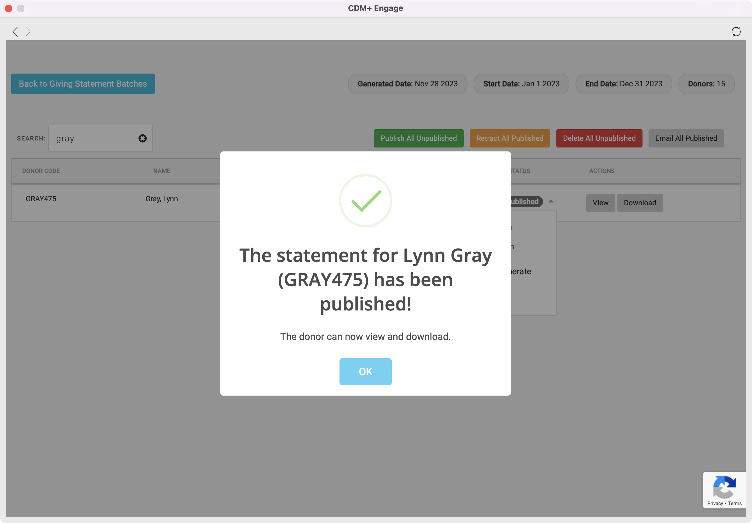 You will then see a pop-up box letting you know the statement has been published and is now visible to your donor. You can then continue to email your statements.