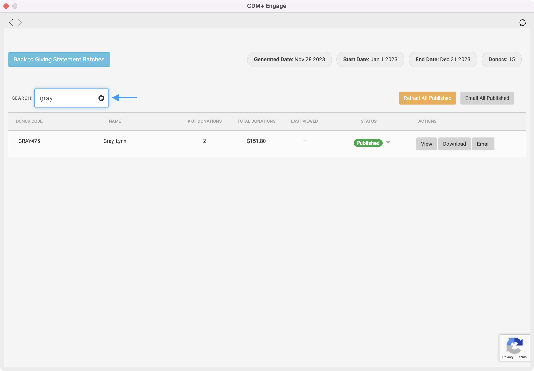 On the next page, you can use the Search field to search for the donor whose statement you need to retract.