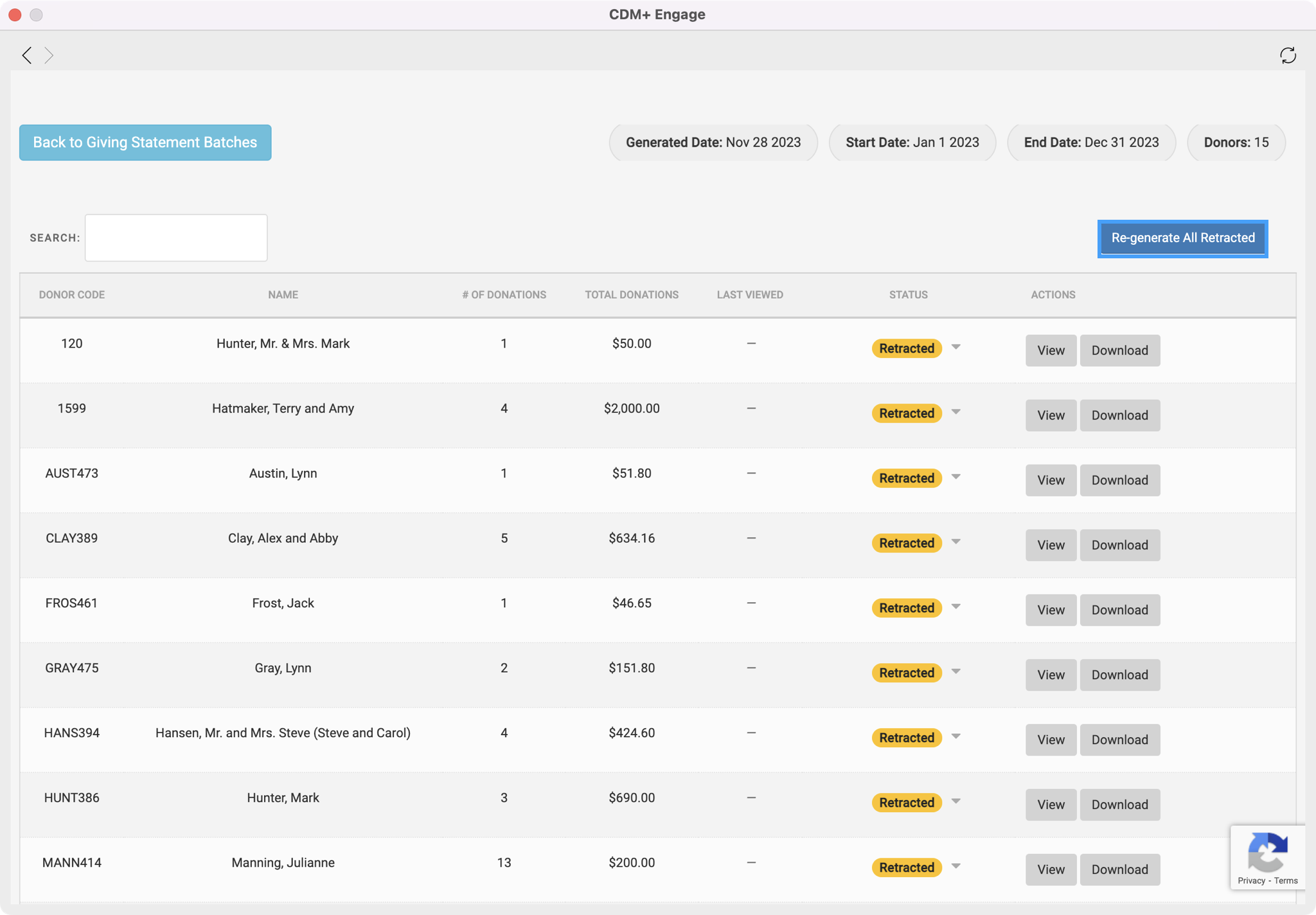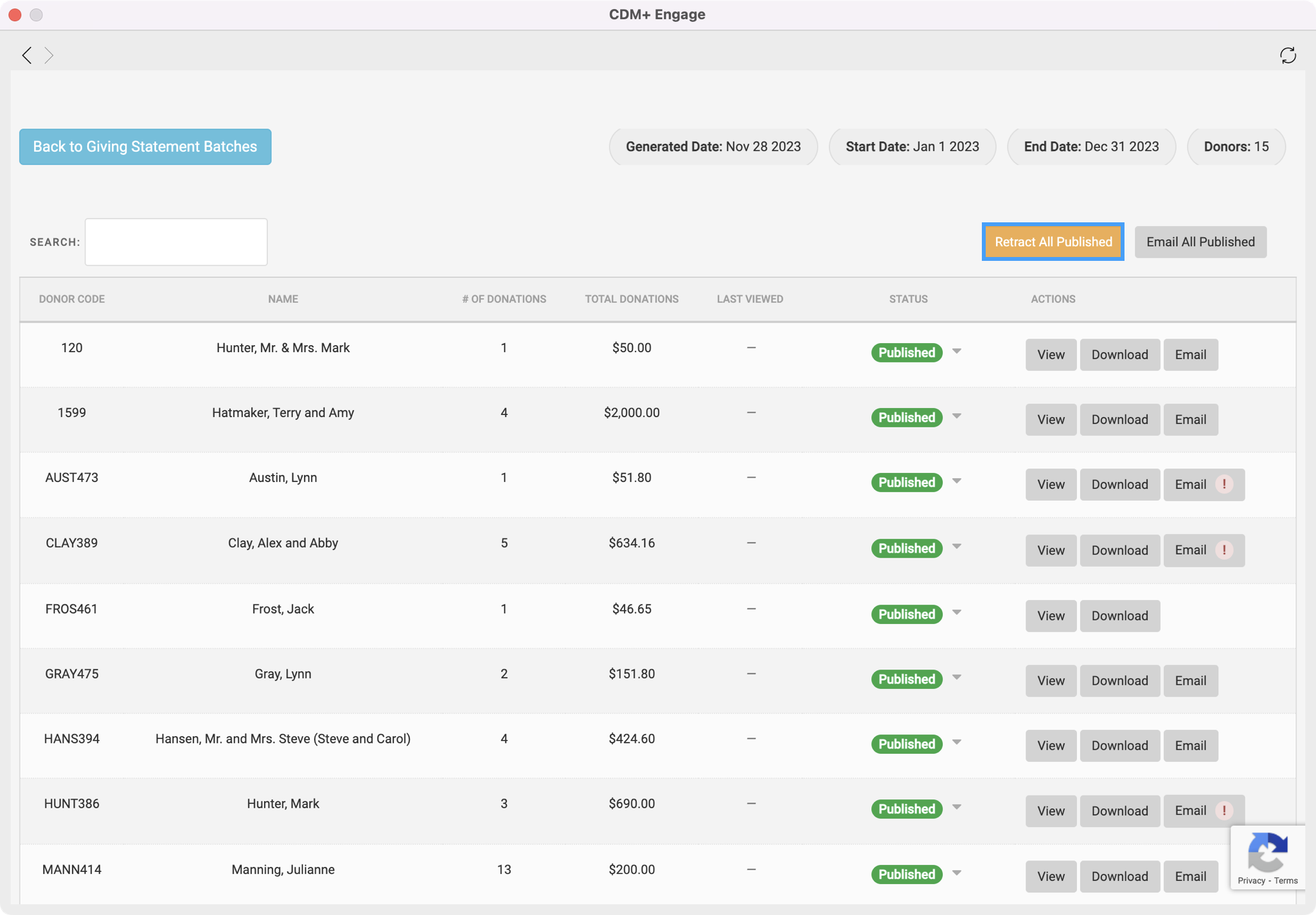 If you realize an error was made on your online statements, you can choose to Retract All Published statements and fix the error. When you retract a statement, the donor will no longer be able to view this statement from their Engage account.
