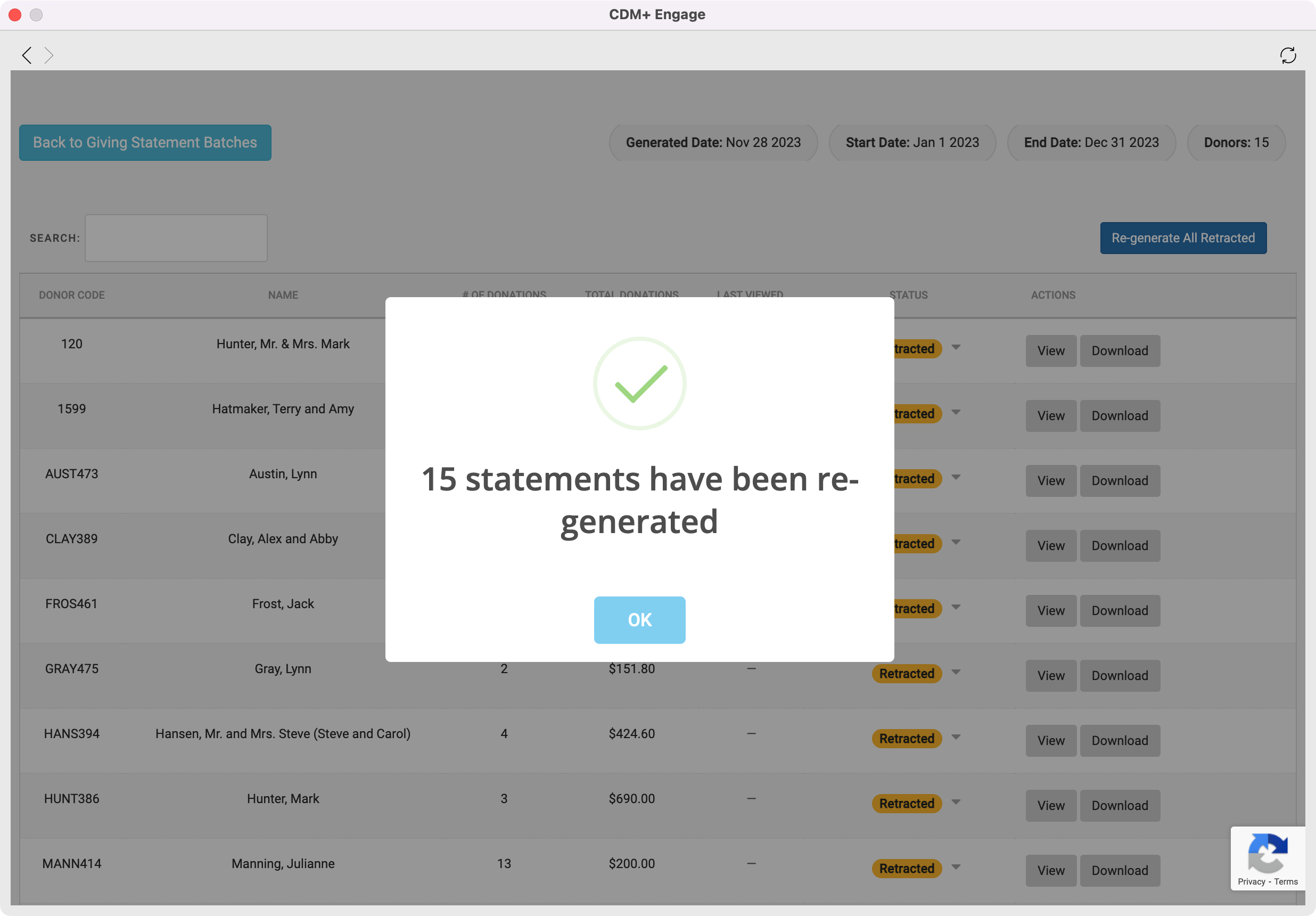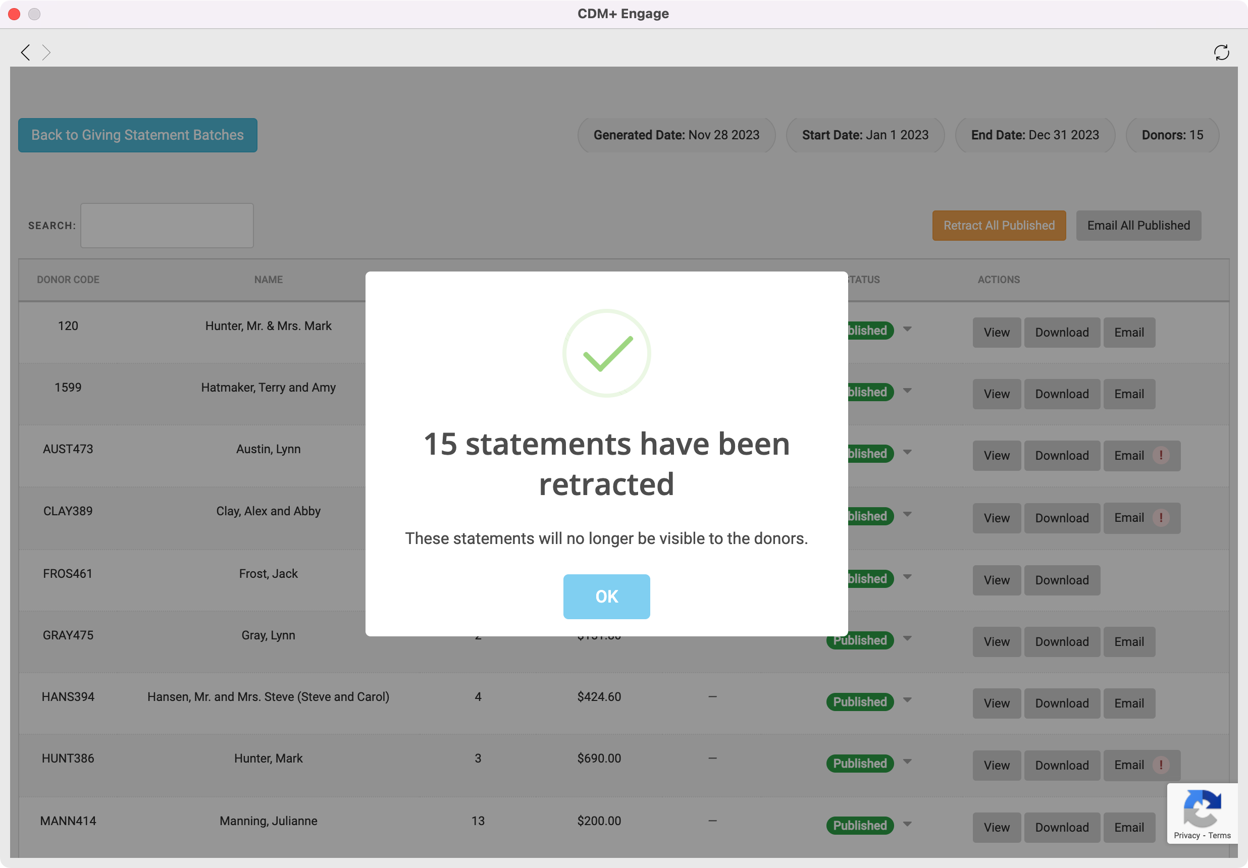 You will then get a pop-up box letting you know the statements have been retracted and are no longer visible to your donors. Click on OK.