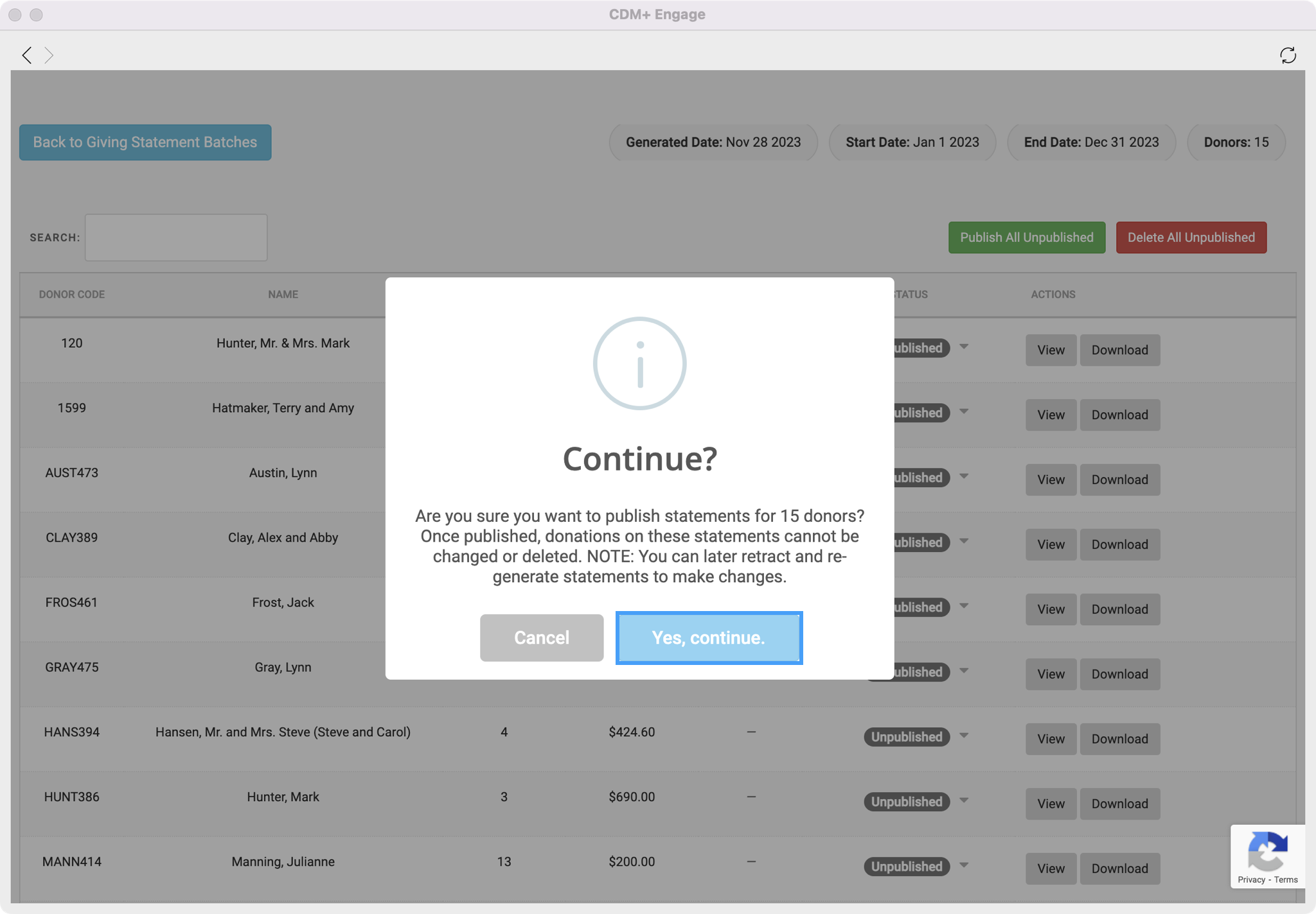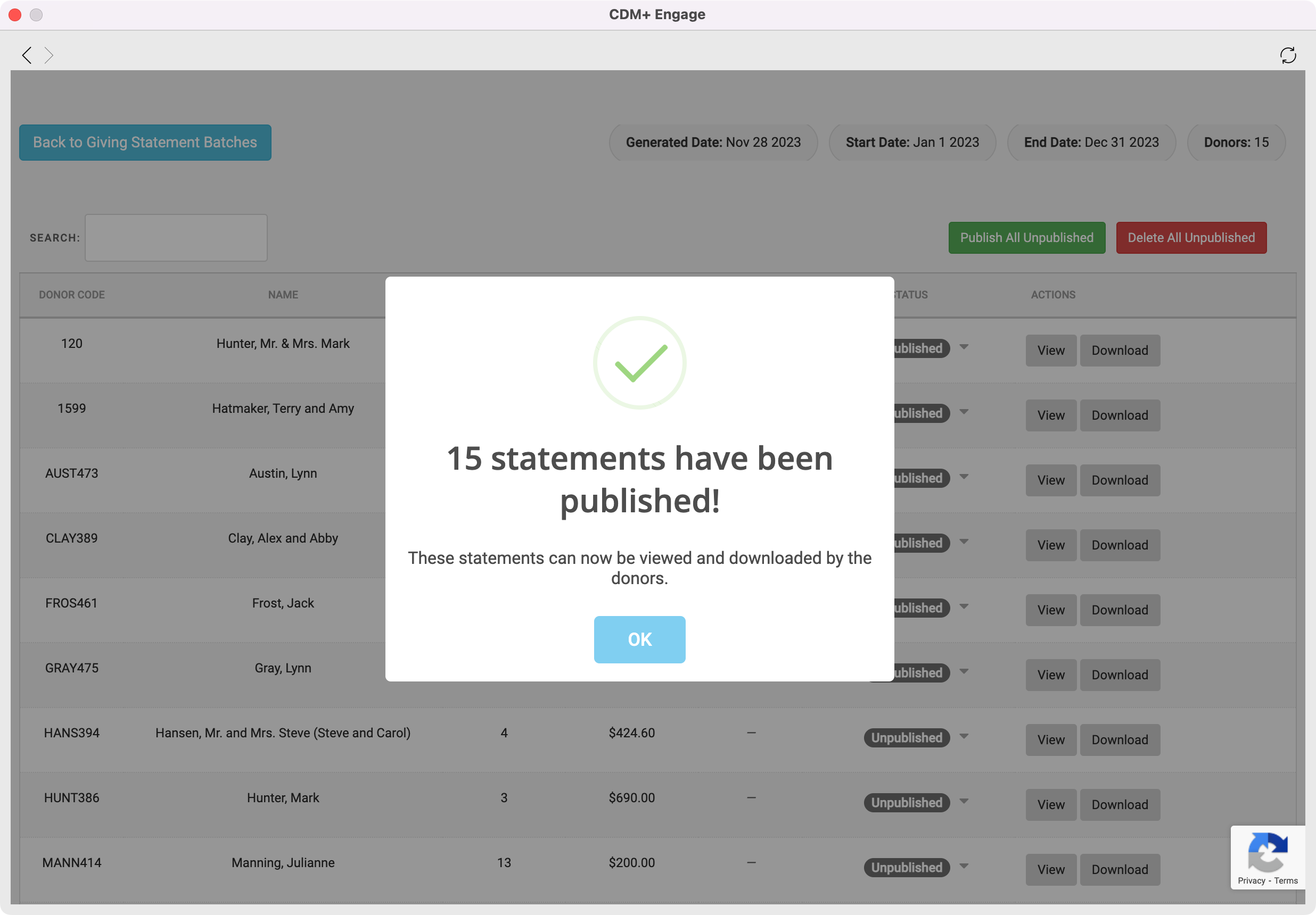 You will then see a pop-up box letting you know your statements have been published and are now visible to your donors. You can then continue to email your statements.