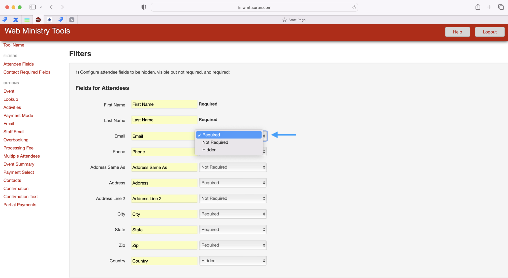 On the next page, you will be able to customize your event tool to get the information that you need from your registrants. Under the Filters section, you can first decide what information you want to gather from each registrant. First and Last name are automatically required but you can use the drop-list boxes to select which other fields you want to be required, not required, or hidden.