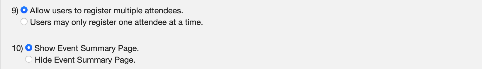 Step 9, allows you to choose if you want a person to be able to register multiple registrants in a single registration. Step 10 ask if you would like to Show or Hide the Event Summary Page.