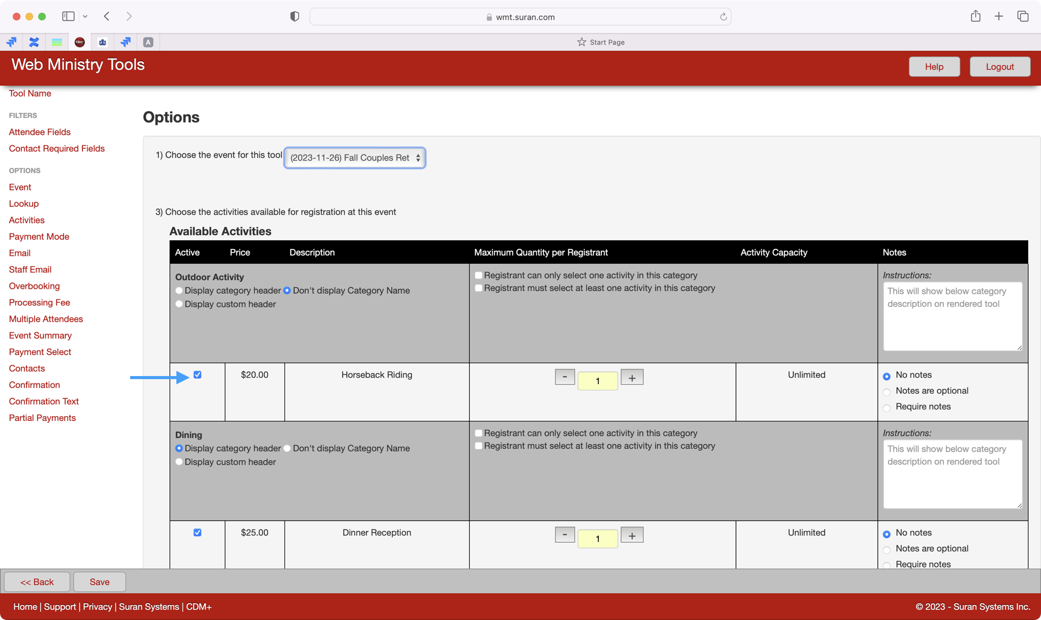 After you select your Event record, you will see the Activities populate that you created for this event. You have many options for how you want your Activities to be displayed. First, if you want an activity to be visible as an option for your registrants, make sure the box to the left of the activity is checked. You can check or uncheck this box at any time depending on your need. For example, you may want an activity visible at first but then if the activity gets full or you had an early bird special you no longer want displayed, you can uncheck this box so that option is no longer visible.