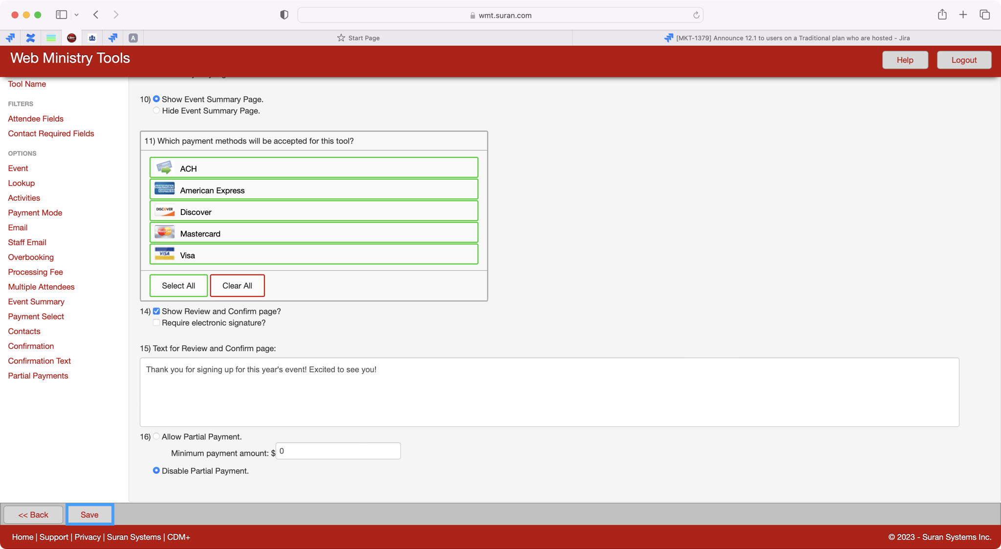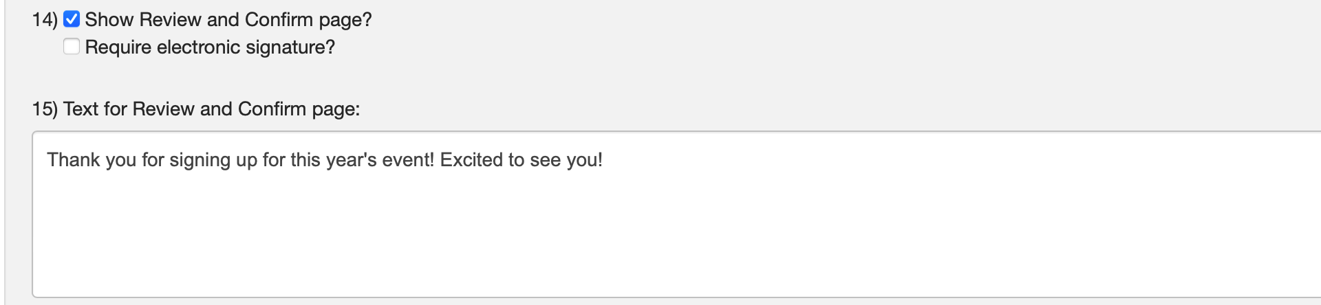 Step 14 allows you to decide if you want to show a Review and Confirm page and if you want to require an electronic signature. If you choose that you want to show a review and confirm page, you'll have the option on step 15 to add text that your registrants will see before submitting their registration. This is a great place to give any last minute instructions or simply say thank you to those who will be attending.