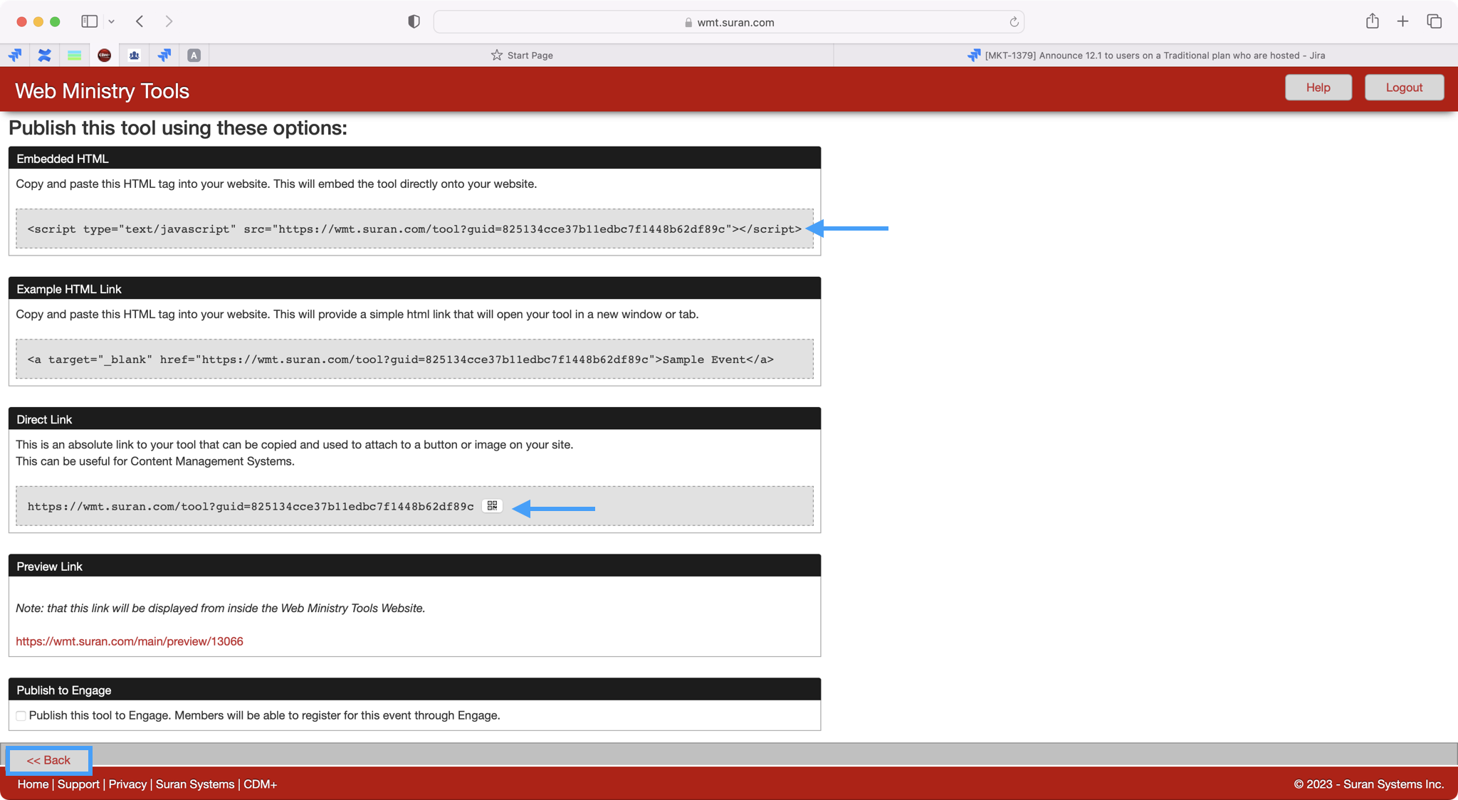 On the next page, you'll see where you can copy your embed script if you want to embed the registration page on your website, the direct link, and/or QR code that you can download for your event. When you have all the links that you need, you can click on Back on the bottom left-hand side to get back to the main page.