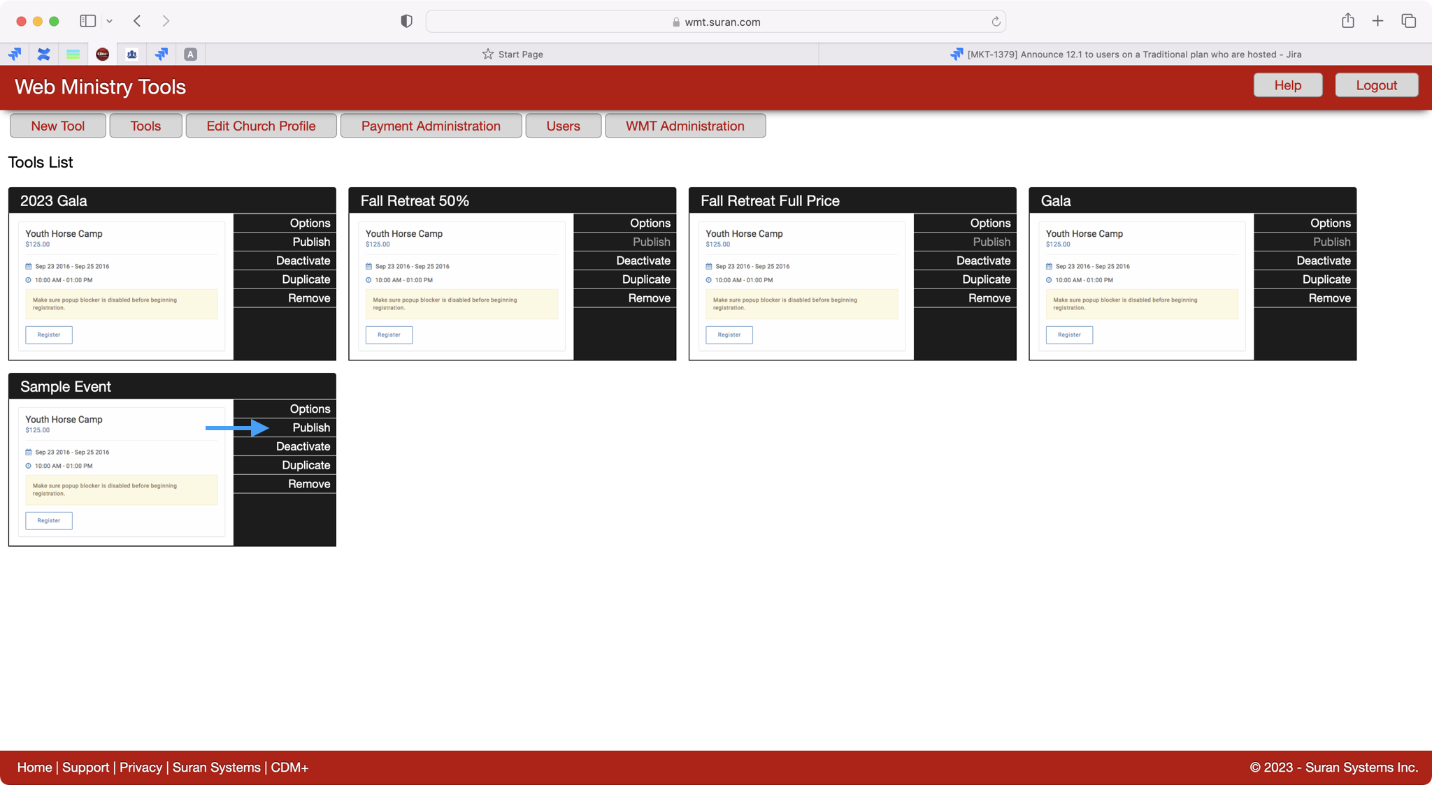 You'll then see your event tool listed on the Tool page. To get to your registration links, click on Publish.