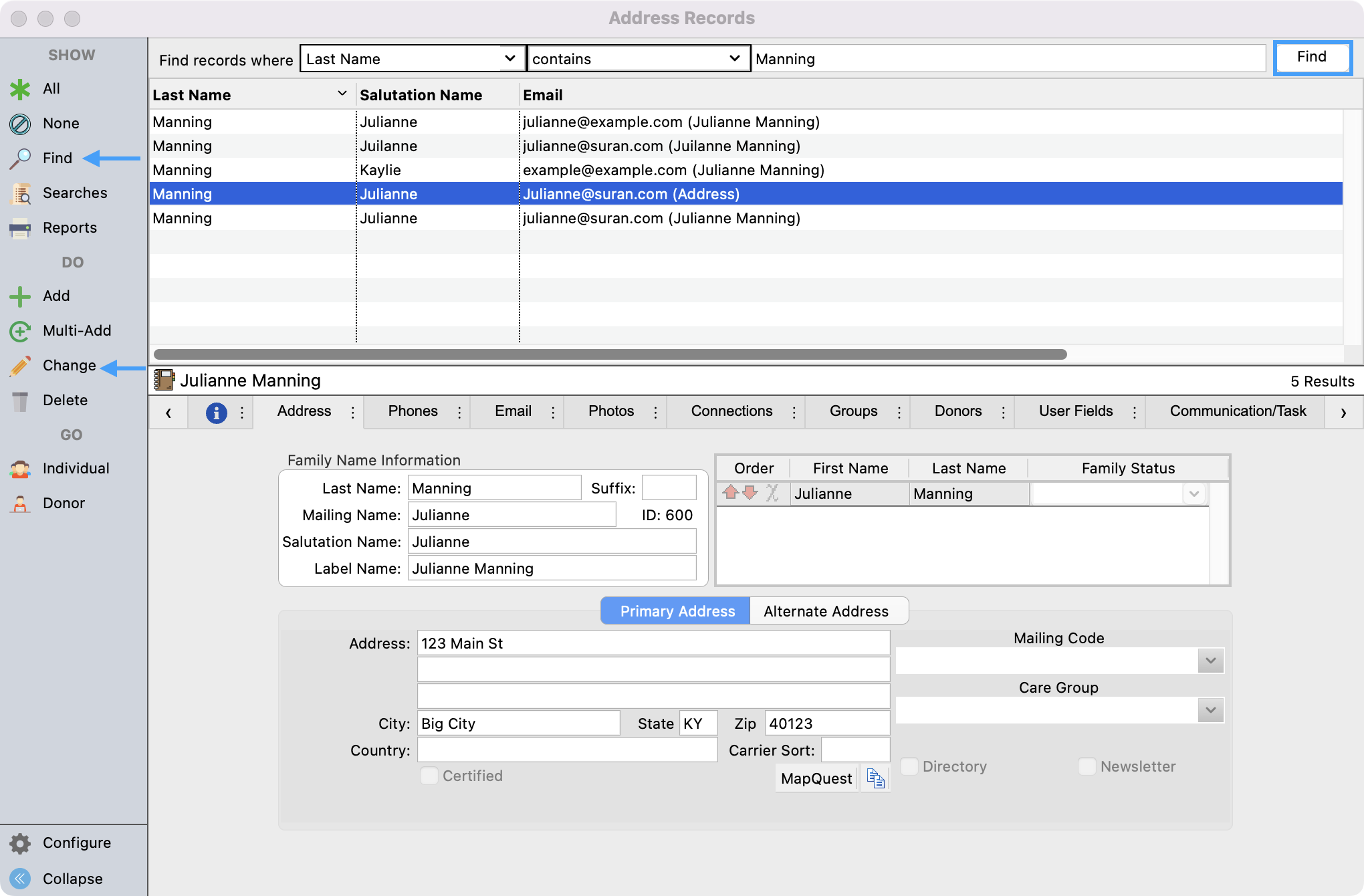 Setup a find to search for the donor you need to update. Then, click to highlight their record and click on Change from the left-hand side menu.