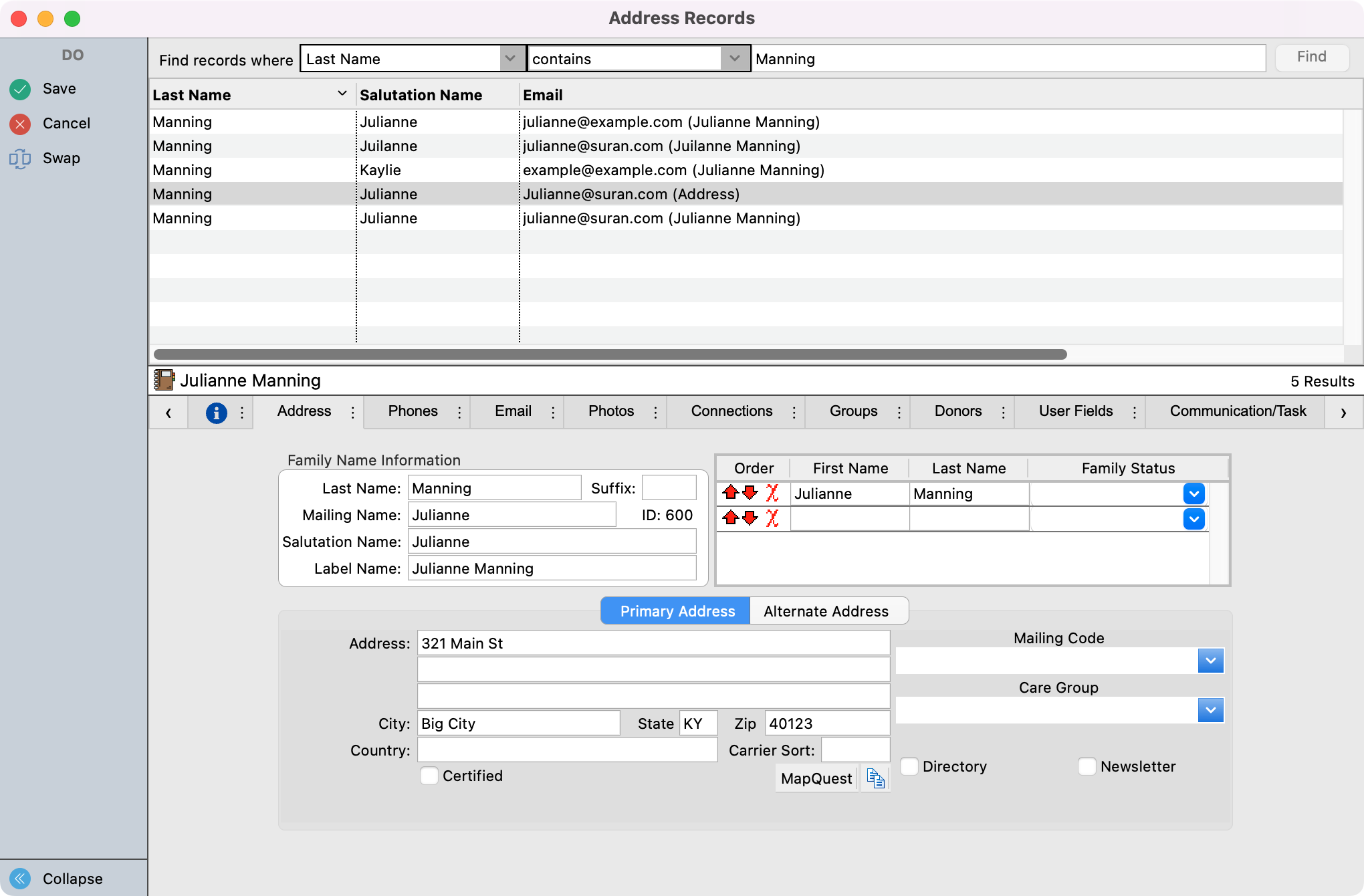 When you need to update a donor's profile such as their address and contact information, you'll want make these changes under their Address record. You will then be prompted to update the Individual and Donor record under the Address record accordingly. If you update the Donor record first, the associated Address record will NOT also be updated. This is why it is important to first start with the Address record.