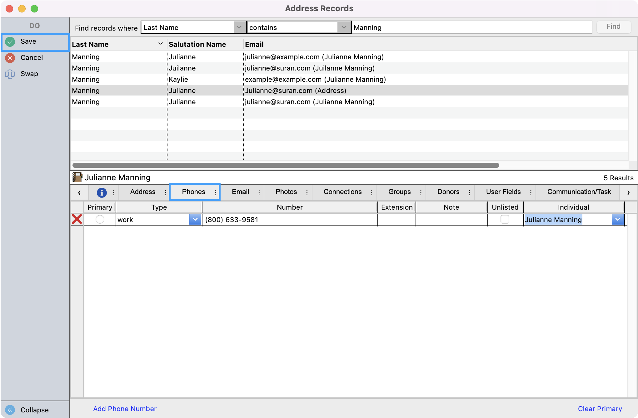 This will make the fields on this window editable. Before saving you can click on any of the tabs that need edited (such as the Phone or Email tabs) and make the necessary updates. Once you have made all the changes that you need, click on Save on the left-hand side menu to save your changes.