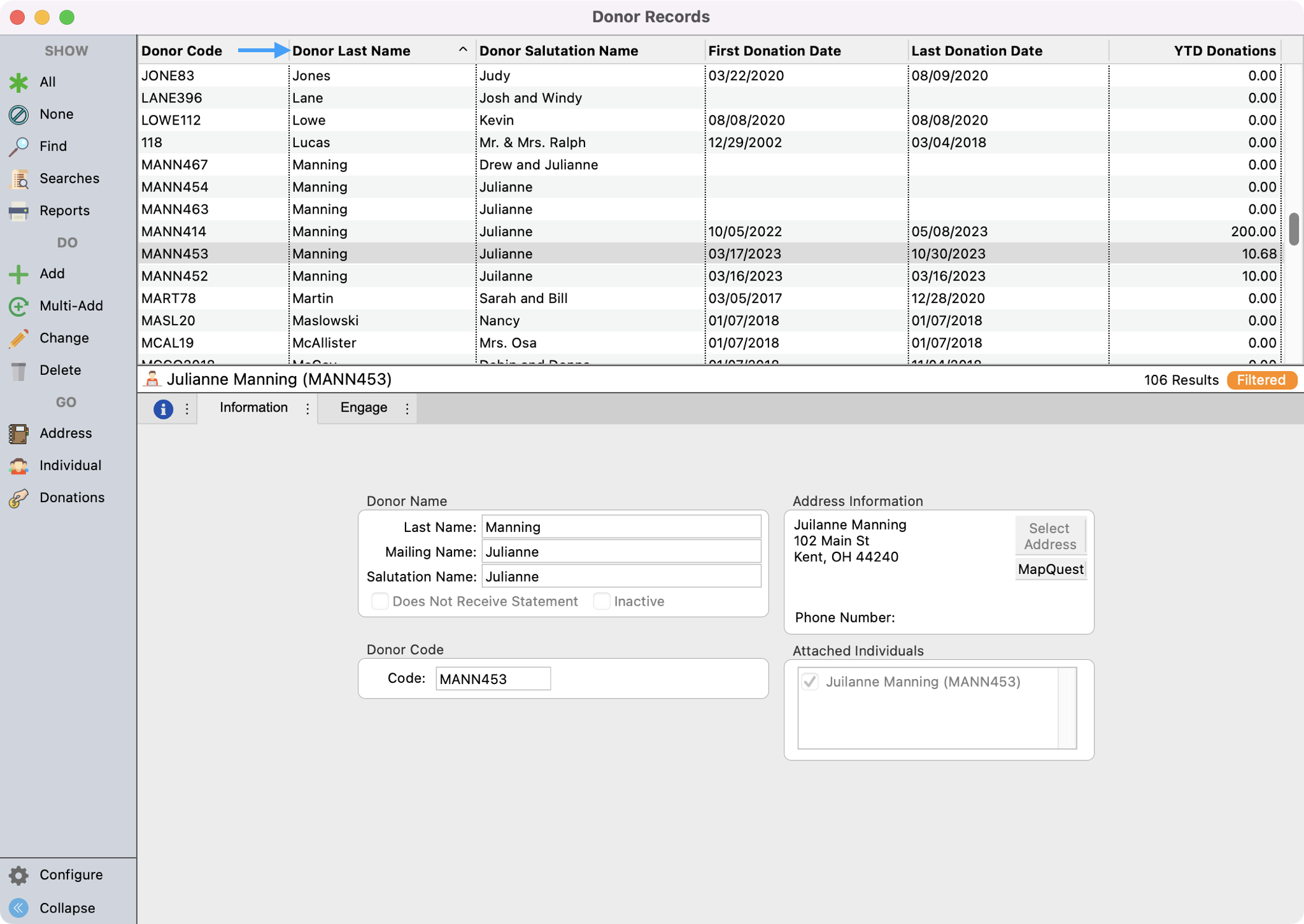 - You can click on the Last name column header to automatically sort the donors by alphabetical order. This will make it easy to spot duplicates. You can also setup a find, if you know which records you want to merge together.
