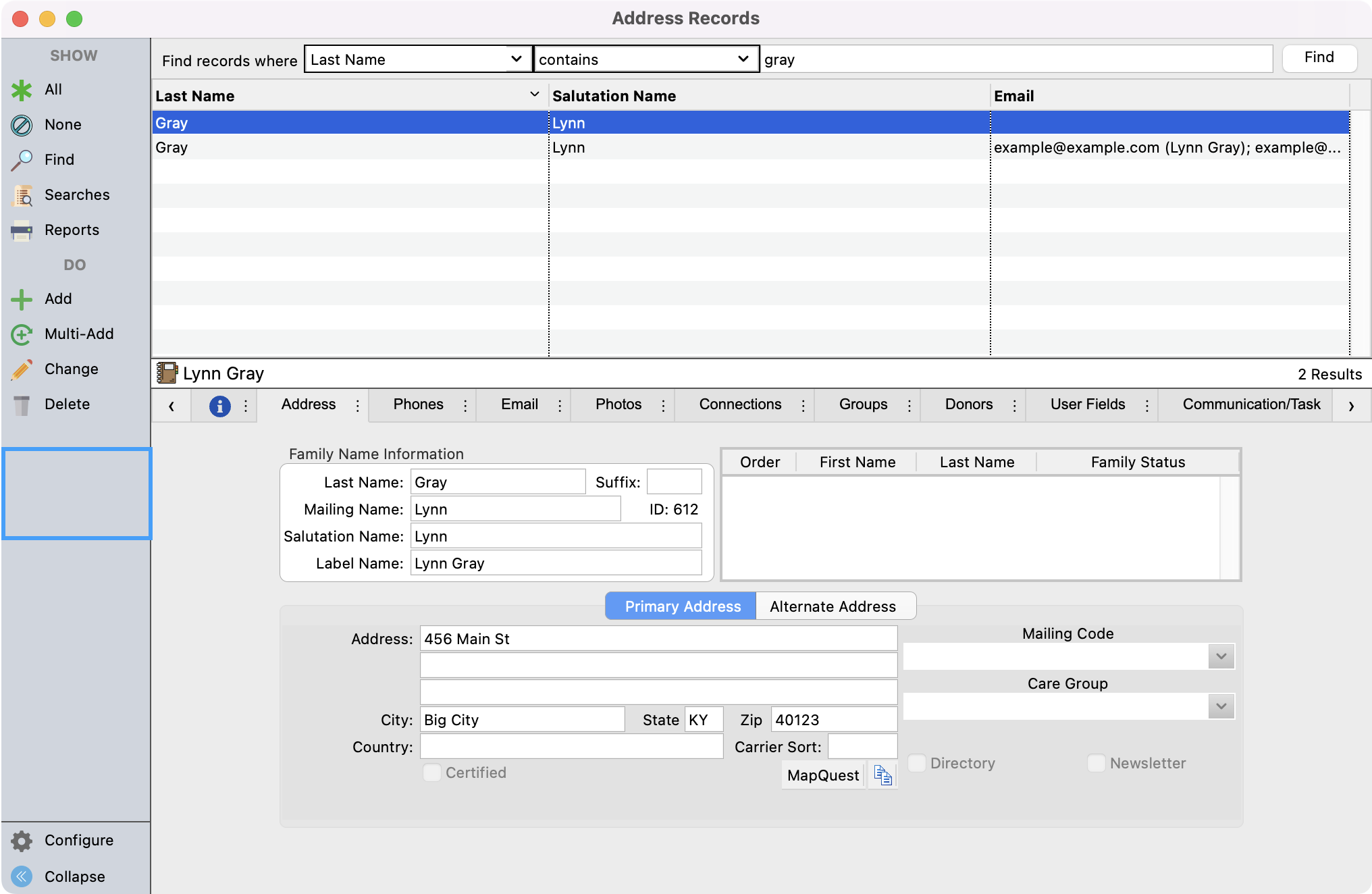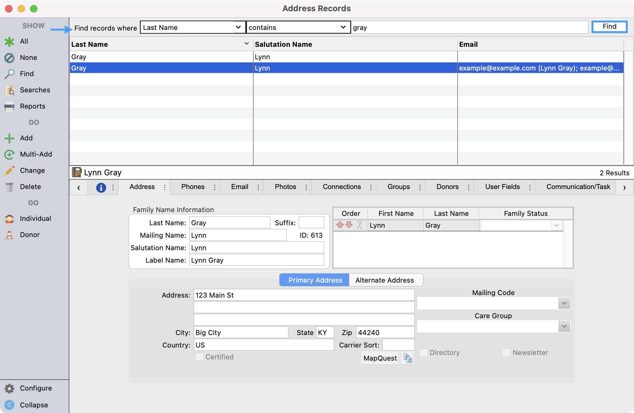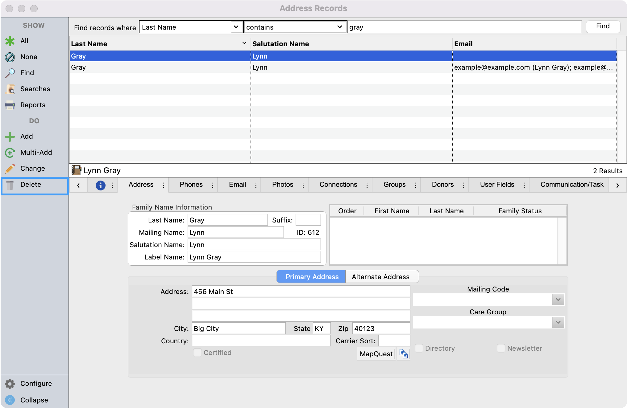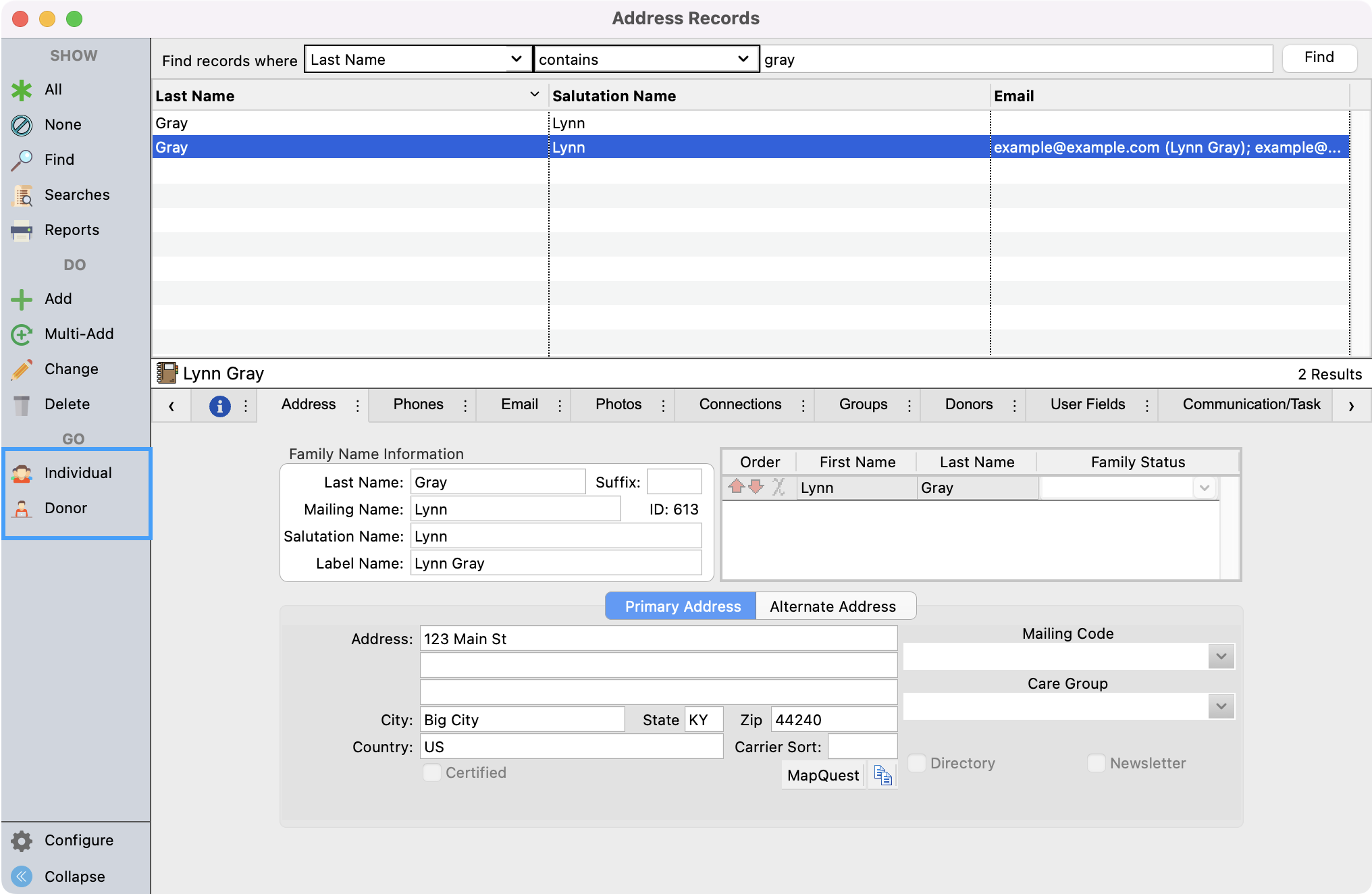 - This will take you to the Address record that is tied to the merged Individual and Donor records. To find the other records that you want to delete, setup a find and search for the other records.