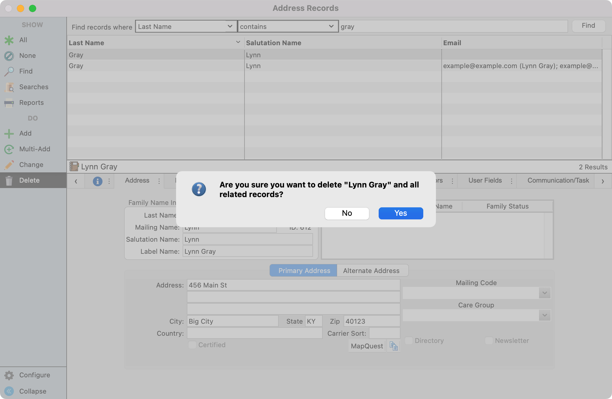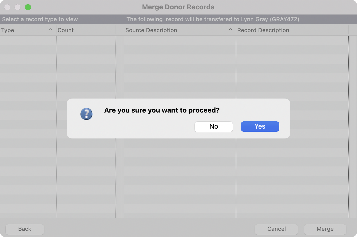 - You'll see a pop-up asking you to confirm that you want to delete this donor and all related records. Click on Yes.