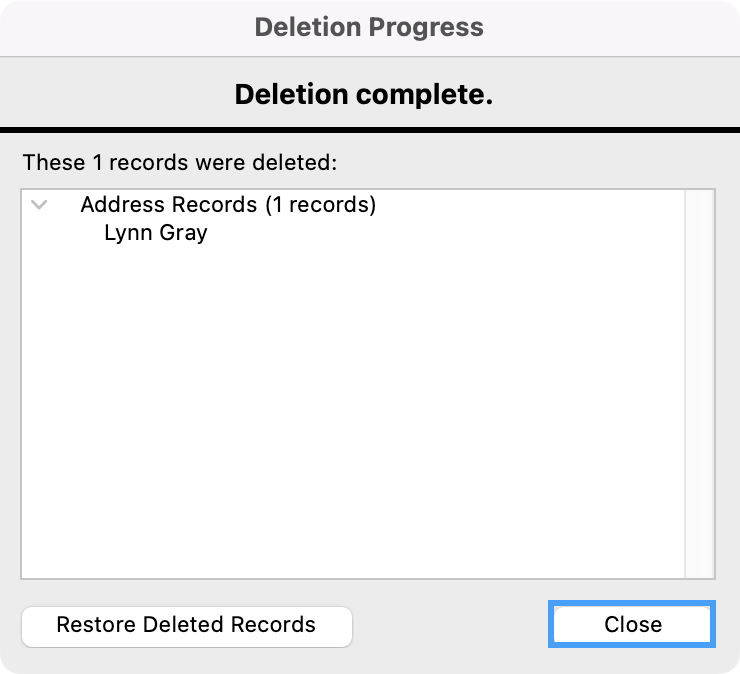 - You then see a window letting you know that the deletion is complete. Click on Close.