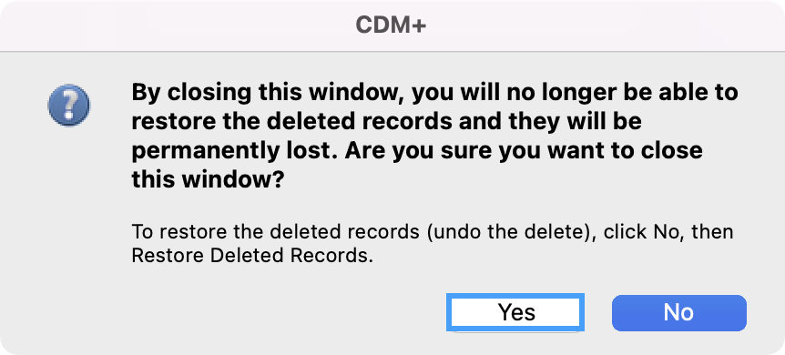 - Lastly, you'll see a pop-up box letting you know that by closing this window, these records will no longer be able to be restored. Click on Yes, to finish deleting these records.