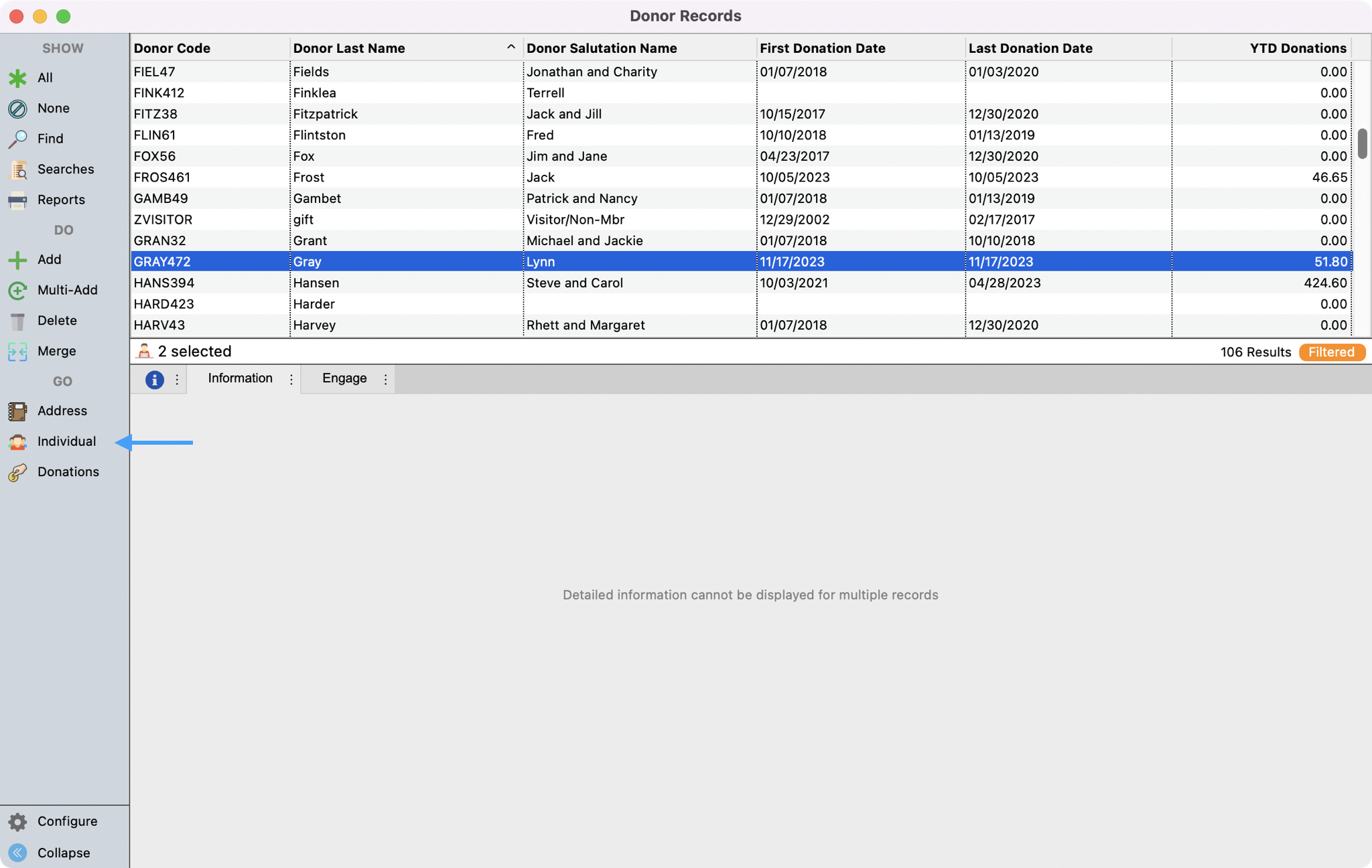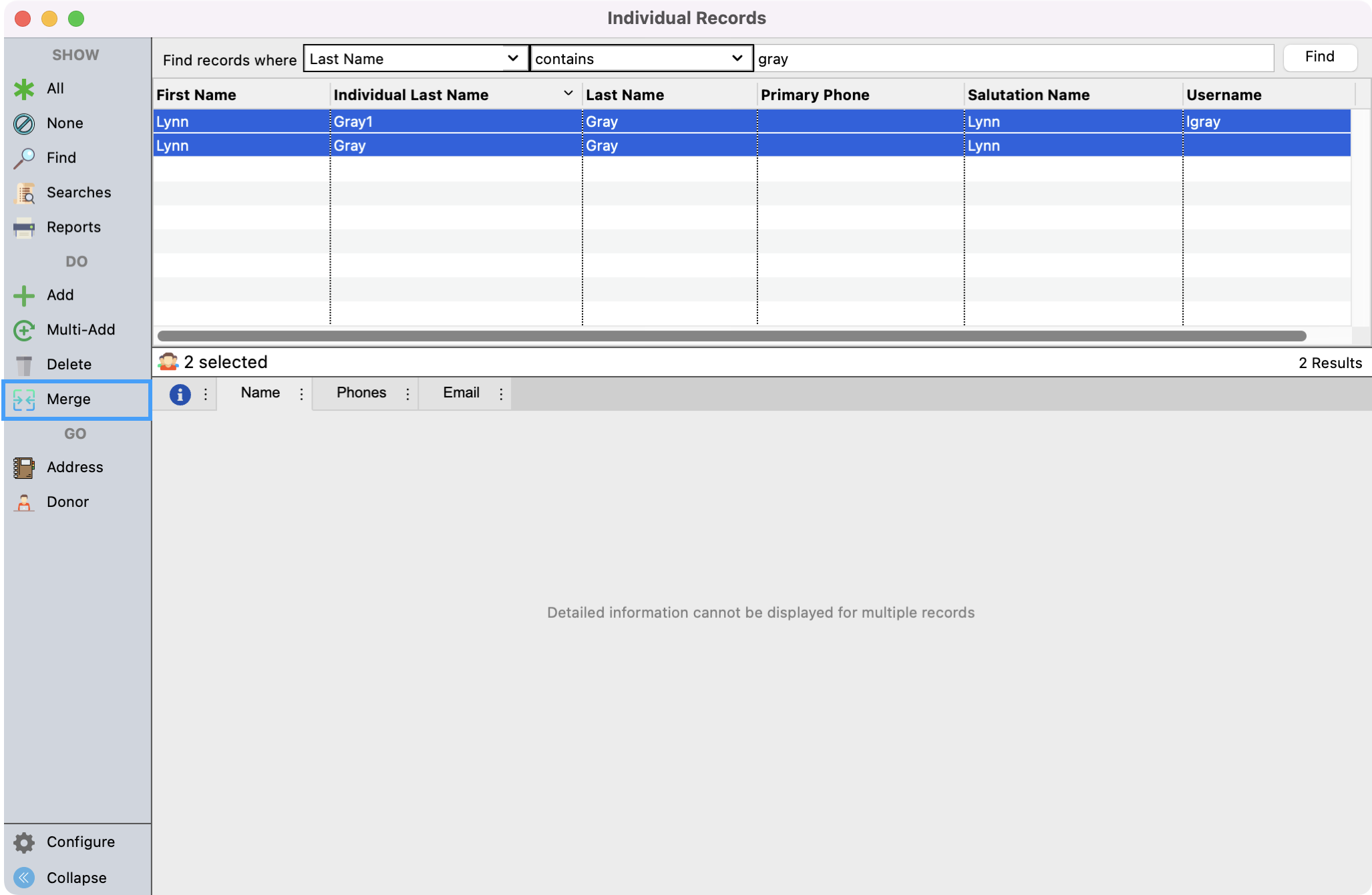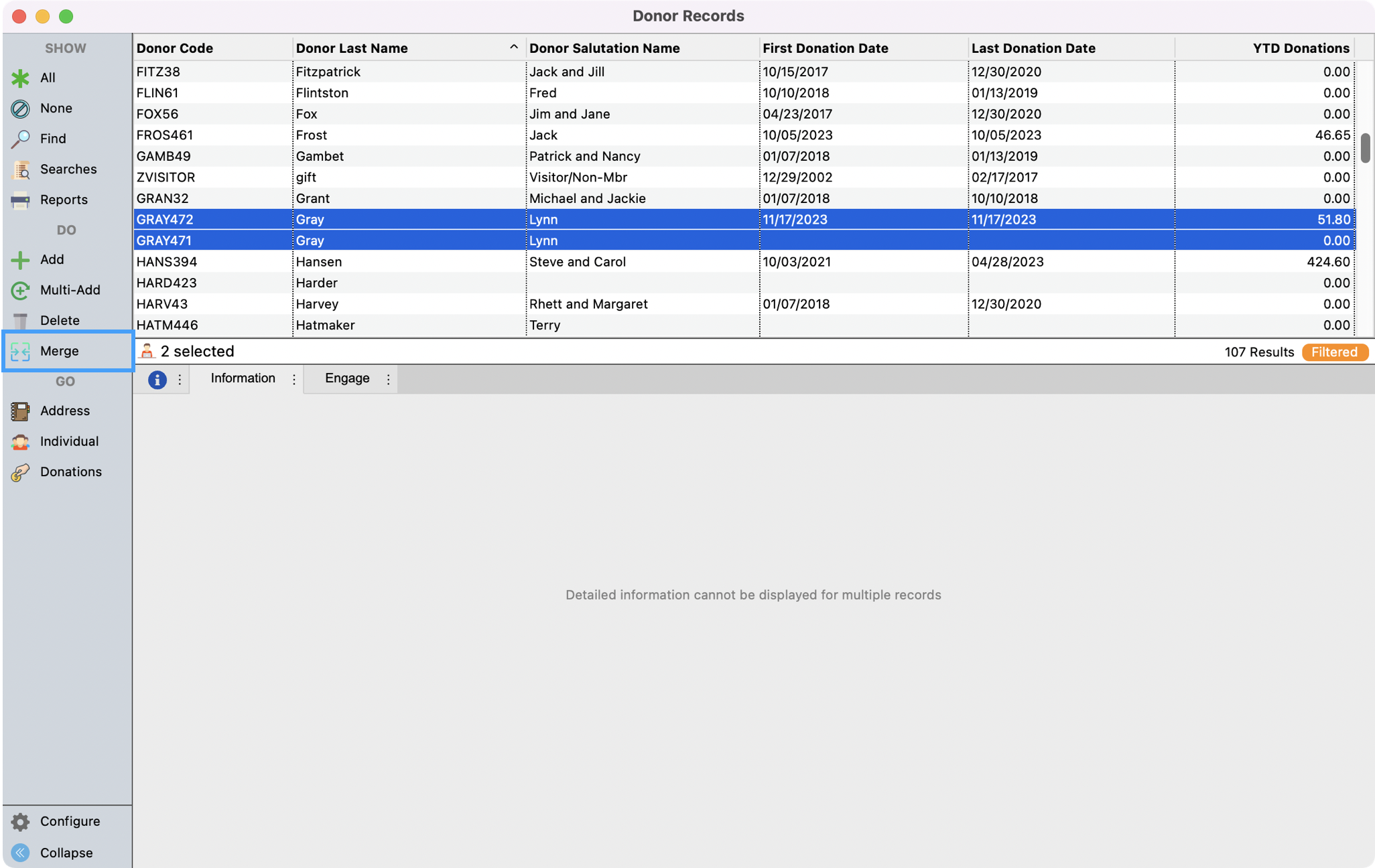 - Now you're ready to merge the Individual records together. You'll want to select the records that you want to merge together. Click to highlight the first record and then hold down the Control key for windows, or Command key for macOS, and click the second record. If there are more than two, you can select all the records you wish to merge. You will then see a Merge option appear on the left-hand side menu. Click this option to begin the process.